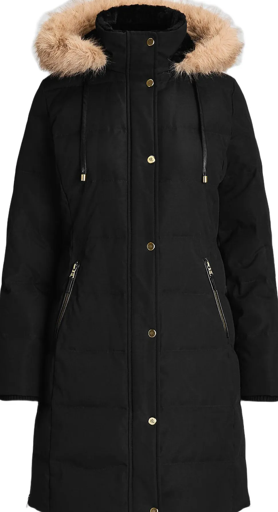Denne kanalquiltede frakke er lige dele stilfuld og praktisk og designet med en aftagelig, imiteret pelstrimmet hætte, en vandafvisende skal og hyggelig 450-fyld-ned for at holde dig tør og varm. Prinsessesømme foran og bagpå forbedrer denne stils strømlinede silhuet, mens “LRL”-indgraverede metalsnaps tilføjer signaturstil