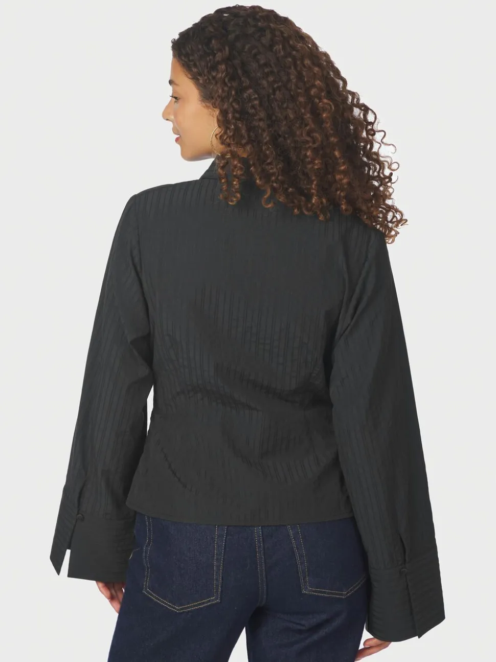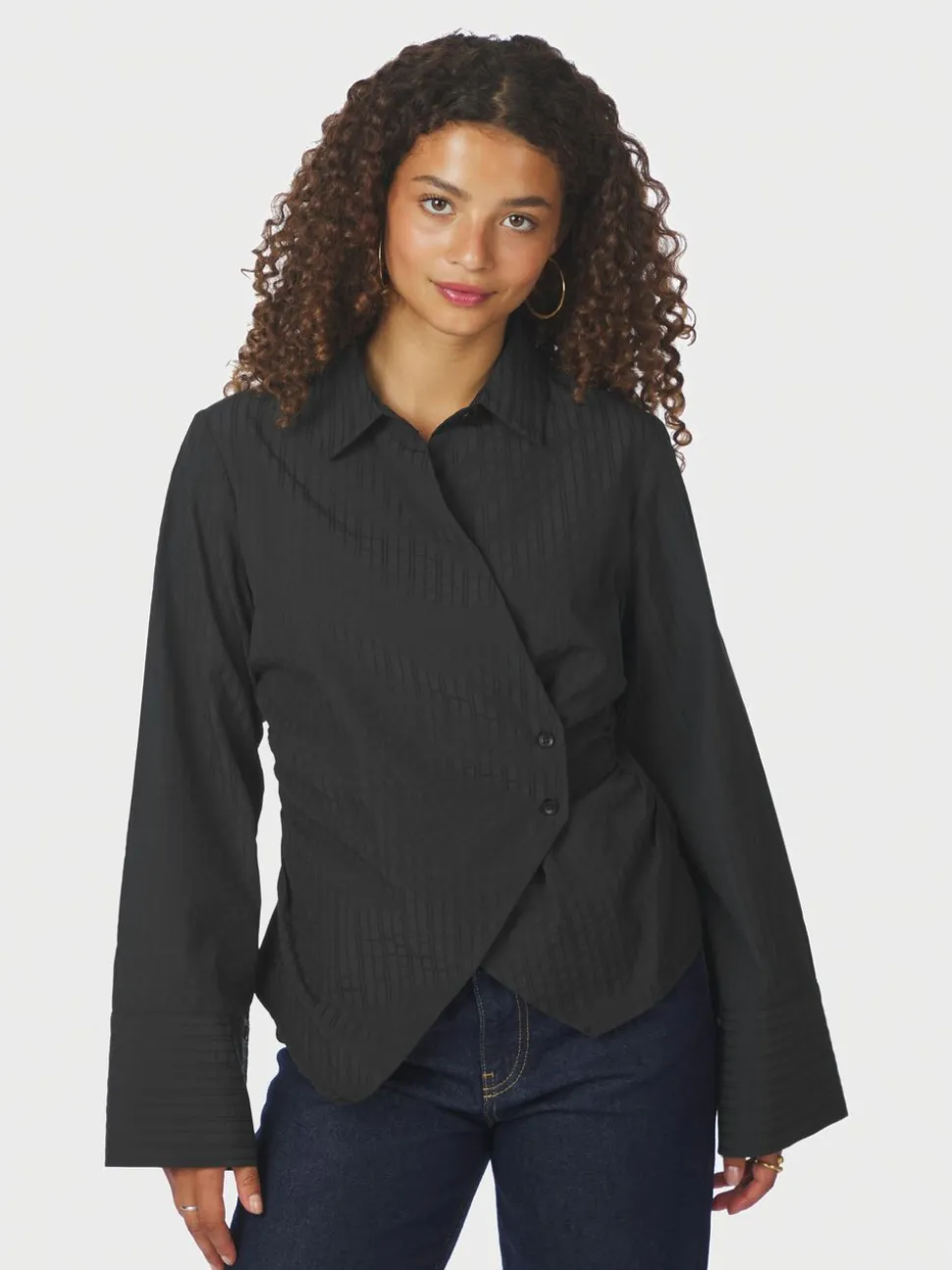 Stribet skjorte med asymmetrisk lukning. Skjorten har en klassisk krave, lange ærmer med brede manchetter og rynkedetaljer i siden. Den lukkes med to knapper i siden og har en slids foran. Materialet er en bomuldsblanding, og den har en almindelig pasform. Modellen er iført størrelse 36.