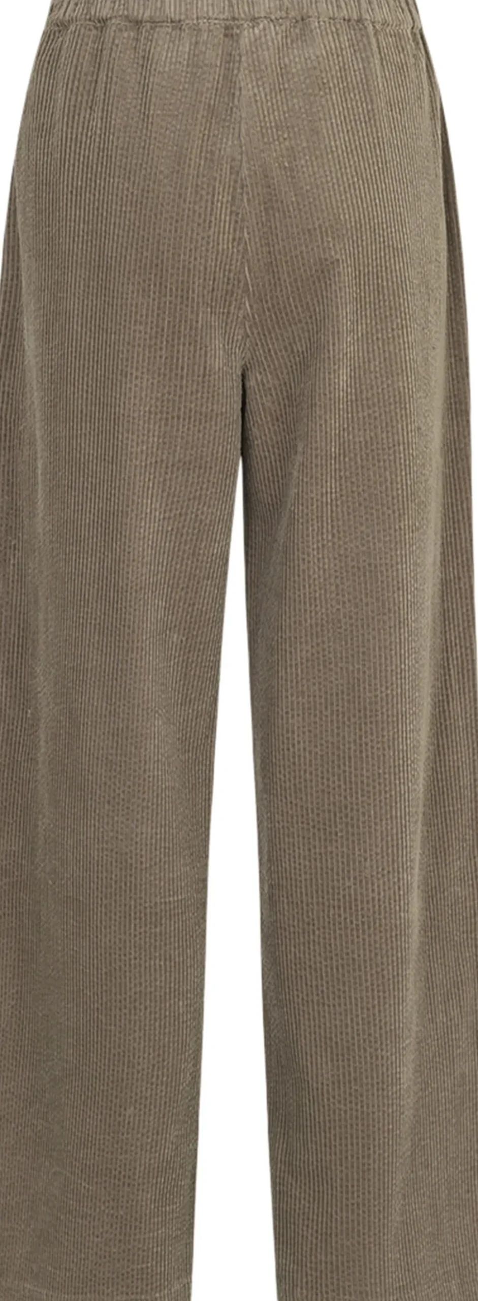 Fløjlbukser med lange, brede ben og høj talje med lynlås og knap og elastik bagpå. FikaMD-bukserne er forede. Modellen er 175 cm høj og bærer en størrelse S/36.