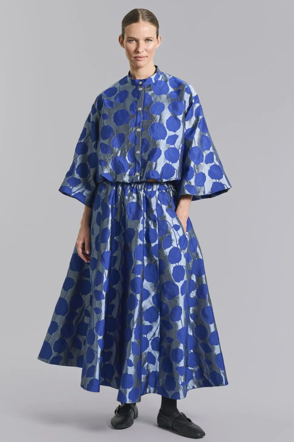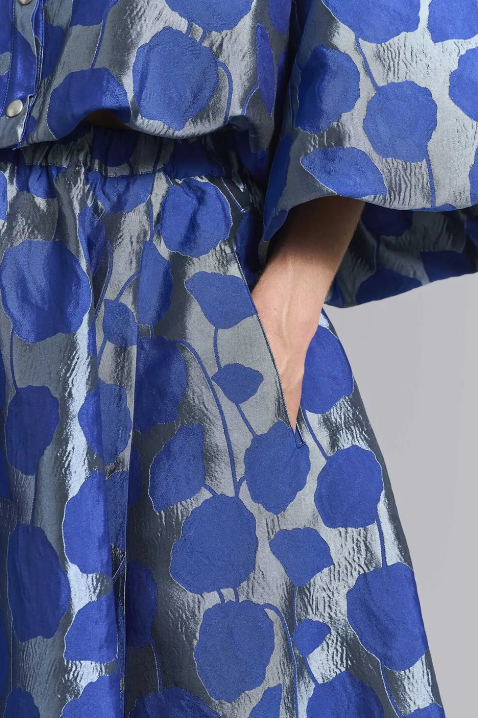 Nederdel i det smukkeste, shiny jacquard stof forsynet med grafiske blomsterranker. Stoffet er relativt kraftigt og giver en fantastisk volumen til nederdelen. En nederdel, der vil gøre hverdagen festlig og festen ekstra elegant.