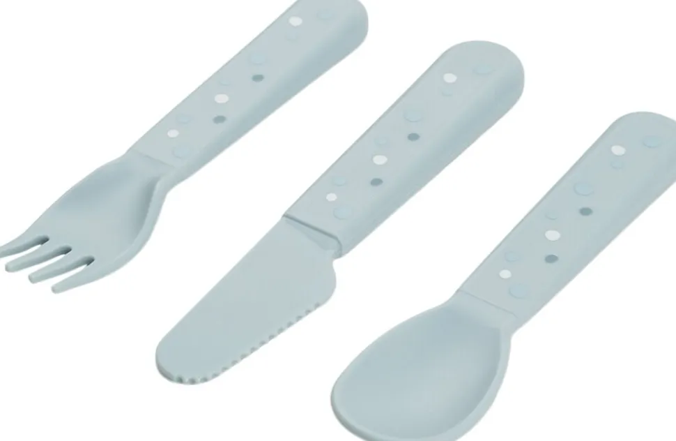 Foodie bestiksættet med Happy dots har afrundede kanter, som gør det sikkert og behageligt for dit barn at øve sig i at spise med bestik. Børnebestiksættet passer perfekt til små hænder og er gennemtestet af børn. Det søde bestiksæt til babyer og tumlinger består af en ske, en gaffel en og kniv. Efter utallige familiemiddage og børnefester kan bestikket affaldssorteres som plast og genanvendes til fremstilling af nye hverdagsprodukter. Det fine, blå bestiksæt er pyntet med legende Happy dots, som gør ethvert måltid til en fest. Bestikket har en mat, silkeblød overflade og matcher resten af Foodie kollektionen.