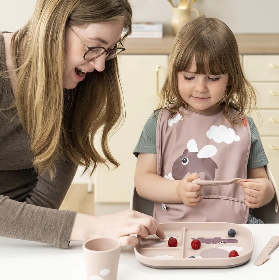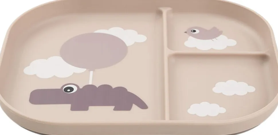 Børnene ved bordet vil elske at spise et måltid af den ruminddelte Foodie tallerken. Et opdelt måltid hjælper dit barn til at fornemme og forstå forskellige smage og konsistenser. Fordel dit barns mad, og lad hvert rum holde maden på plads. Tallerkenens høje kanter hjælper dit barn med at fange maden, mens den praktiske, skridsikre bund sørger for, at tallerkenen bliver, hvor den skal. Tallerkenen er designet til hverdagslivet med børn og tåler både opvaskemaskine og mikroovn. Den ruminddelte, pudderfarvede tallerkener har et legende Happy clouds-motiv. Croco og Birdee udforsker en verden i skyerne og inviterer dit barn til at opleve nye smage og konsistenser. Bundens mørke pudderfarve skaber en fin, tofarvet detalje.