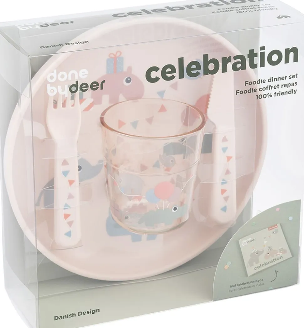 Middagssæt i pudderfarve med tallerken, glas, kniv, gaffel og en lille bog