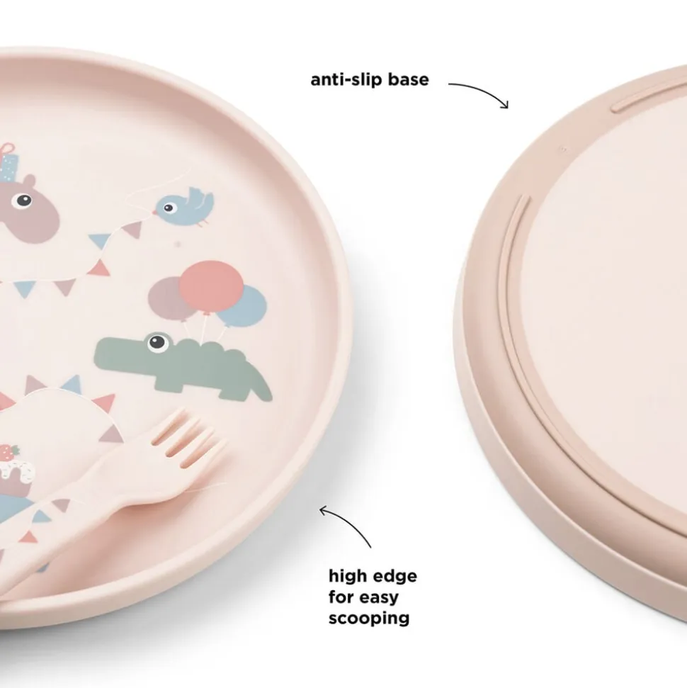 - Materiale:Tallerken: 100% fødevarekvalitet PP med antislip TPE. Bestik: 100% fød