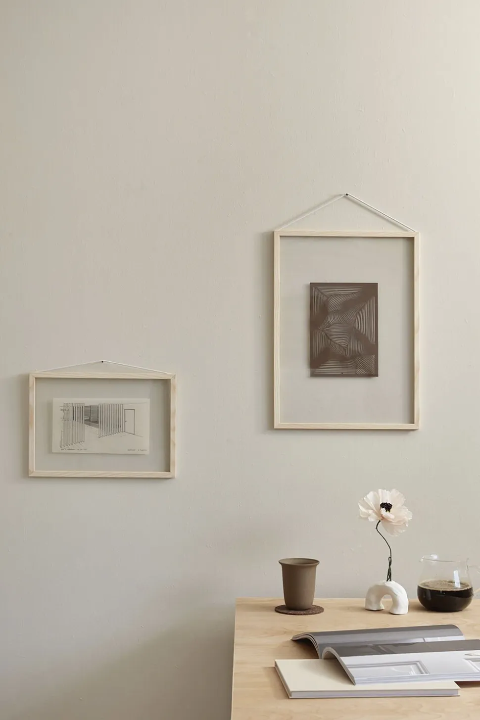 Frame consists of two pieces of acrylic glass, four lists made of either ash or aluminium and a rubber band.