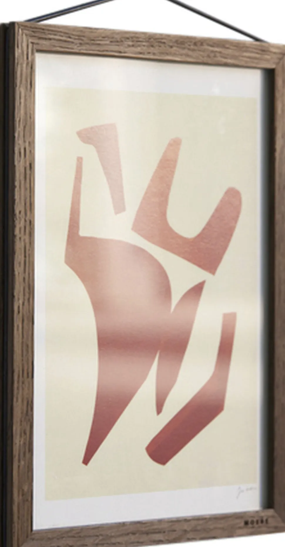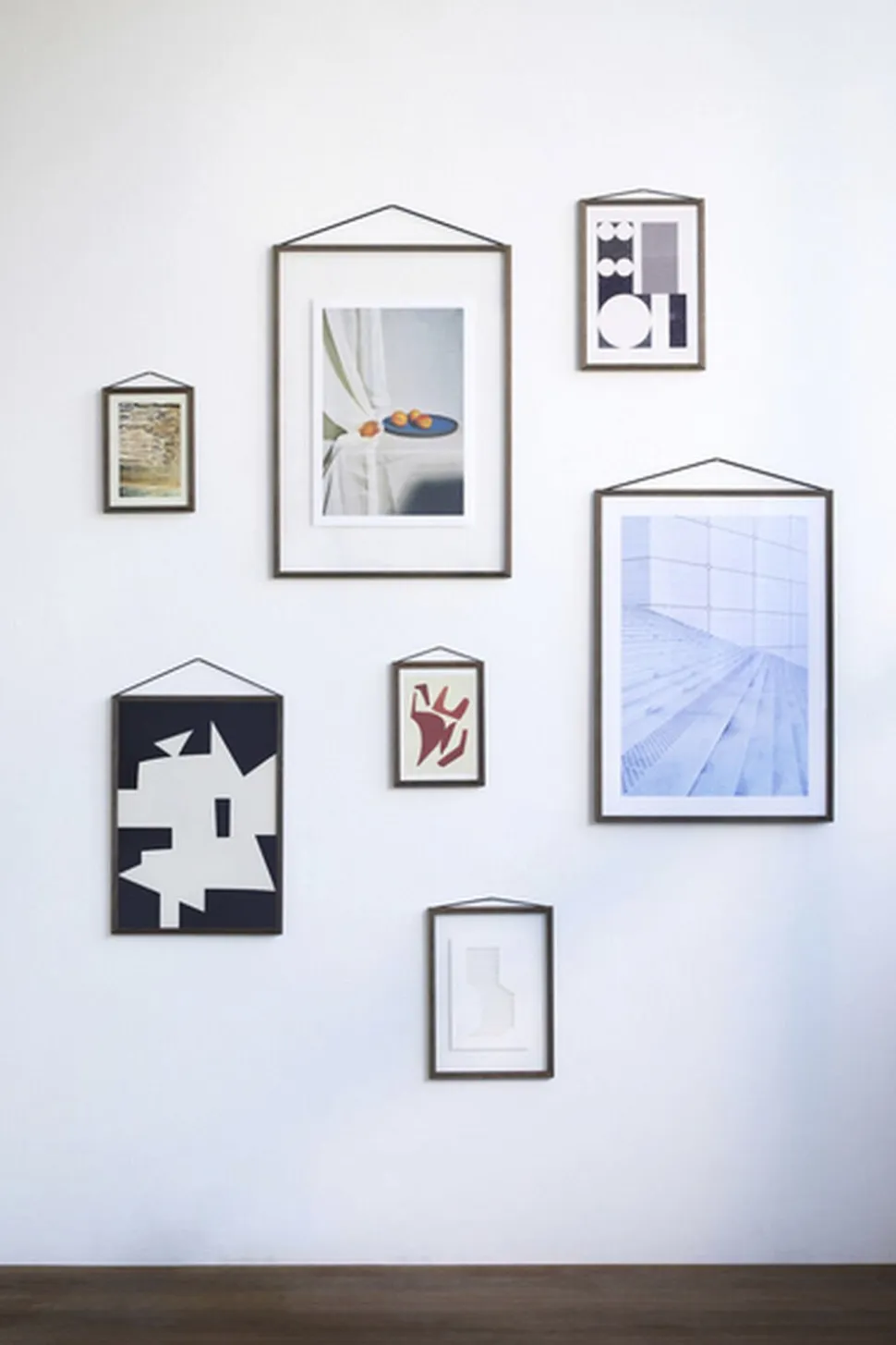 Rammen består af to stykker akrylglas, fire lister og et gummibånd. Gummibåndet holder begge rammen sammen og bruges til at hænge rammen på væggen. Den enkle, men smarte konstruktion gør det muligt at hænge rammen i begge retninger eller endda at blive set fra begge sider, hvilket giver dine kunstværker eller fotografier det fokus, de fortjener. Vælg mellem ti forskellige finishes og seks forskellige størrelser (40 x 50 cm og 50 x 70 cm fås kun i eg og sort)
