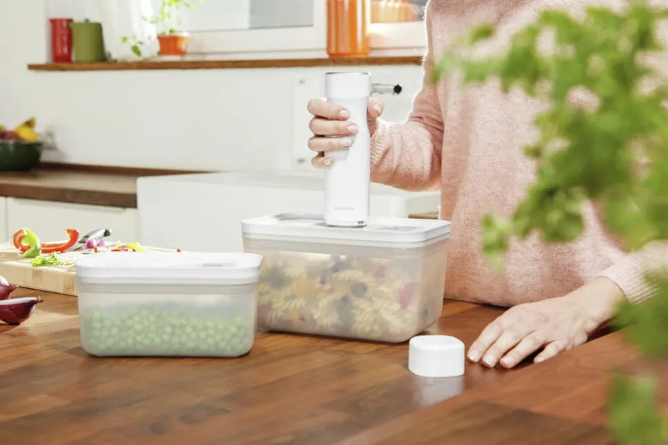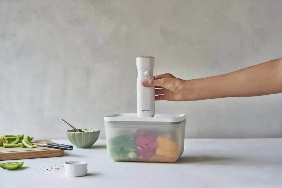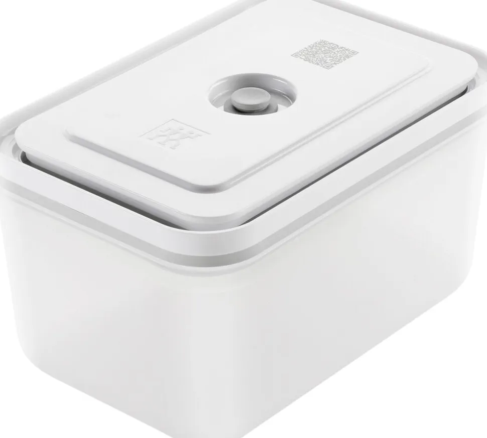 ZWILLING FRESH & SAVE er et vakuumopbevaringssystem, der holder maden frisk op til 5x længere. Opbevaringssystemet bibeholder vigtige næringsstoffer og vitaminer i den opbevarede mad. Nu har du muligheden for at komme i gang med at foodpreppe, minimere madspild, og i det hele taget at optimere måden at gemme råvarer på. Varmebestandig op til 97 °C. Fryseegnet indtil -20 °C. Låg og beholder kan gå i mikroovnen samt opvaskemaskinen. Let og brudsikker. Materialer: BPA fri plast (beholder og låg), silikone (ventil, tætning). Vakuumlåg med innovativ dobbelt forseglingsteknologi. Enkel registrering med den gratis app der vha. QR koden holder styr på holdbarhed og indhold. Forhindrer frostskader på madvarer. Holder maden friskere i op til 5 gange længere sammenlignet med andre opbevaringsmetoder uden brug af vakuum.Vakuumopbevaring bibeholder vigtige vitaminer samt næringsstoffer i den opbevarede mad. Beholdere i S, M, L kan nemt stables sammen.