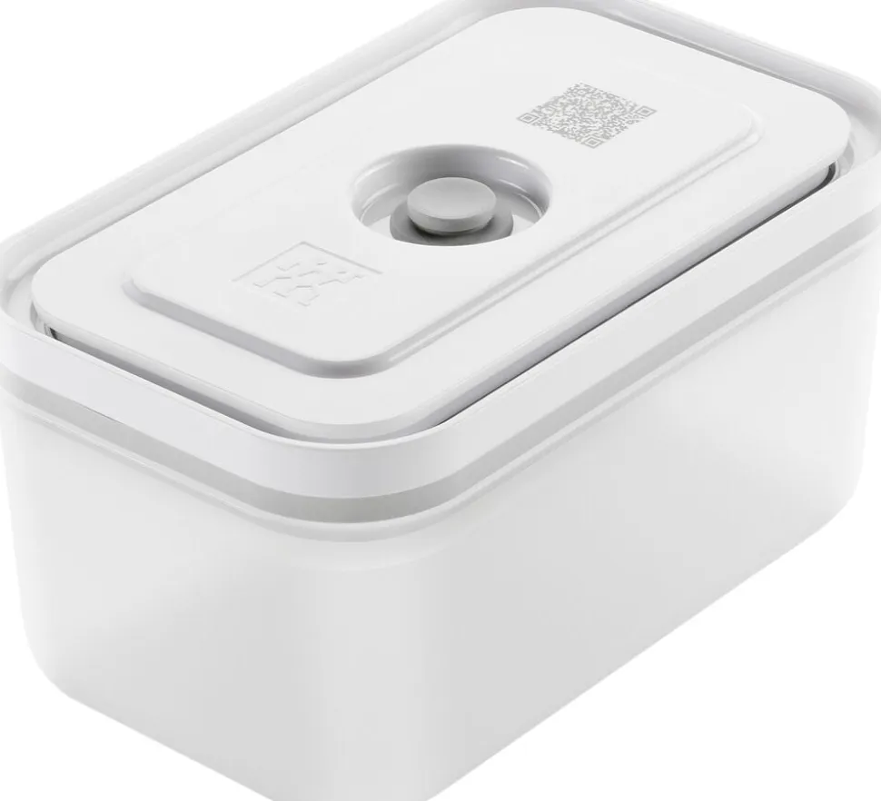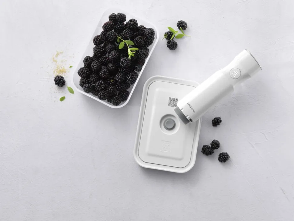ZWILLING FRESH & SAVE er et vakuumopbevaringssystem, der holder maden frisk op til 5x længere. Opbevaringssystemet bibeholder vigtige næringsstoffer og vitaminer i den opbevarede mad. Nu har du muligheden for at komme i gang med at foodpreppe, minimere madspild, og i det hele taget at optimere måden at gemme råvarer på. Varmebestandig op til 97 °C Fryseegnet indtil -20 °C. Låg og beholder kan gå i mikroovnen samt opvaskemaskinen. Let og brudsikker. Materialer: BPA fri plast (beholder og låg), silikone (ventil, tætning). Vakuumlåg med innovativ dobbelt forseglingsteknologi. Enkel registrering med den gratis app der vha. QR koden holder styr på holdbarhed og indhold. Forhindrer frostskader på madvarer. Holder maden friskere i op til 5 gange længere sammenlignet med andre opbevaringsmetoder uden brug af vakuum. Vakuumopbevaring bibeholder vigtige vitaminer samt næringsstoffer i den opbevarede mad. Beholdere i S, M, L kan nem stables sammen