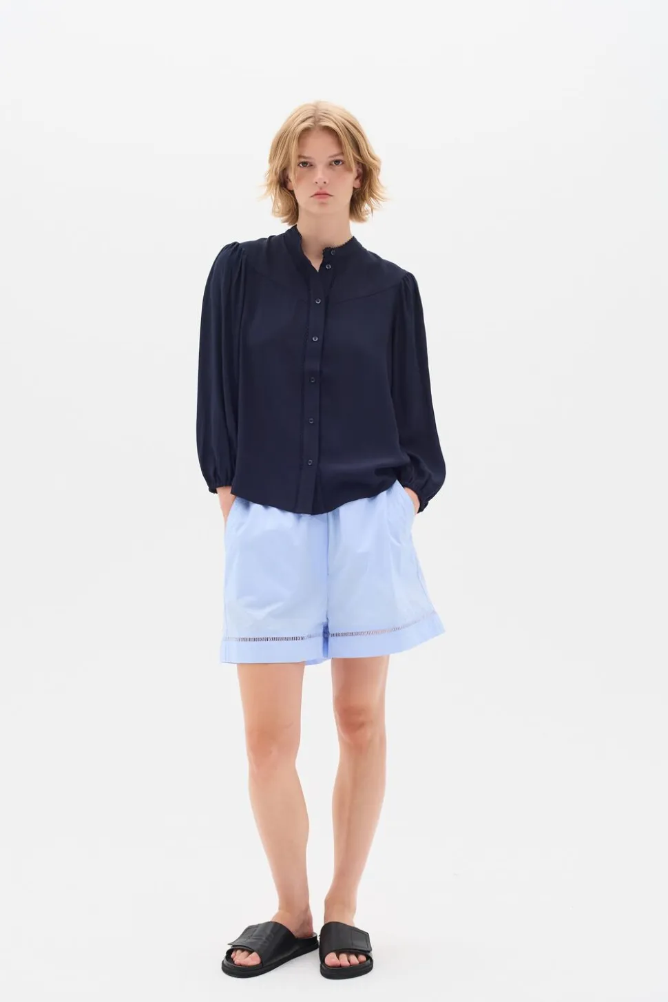 Shorts i let poplin med feminine detaljer og elastisk talje. De afrundede sømme og diskrete sidelommer tilfører et blødt udtryk til det strukturerede materiale. Style med matchende top for et gennemført og moderne look.