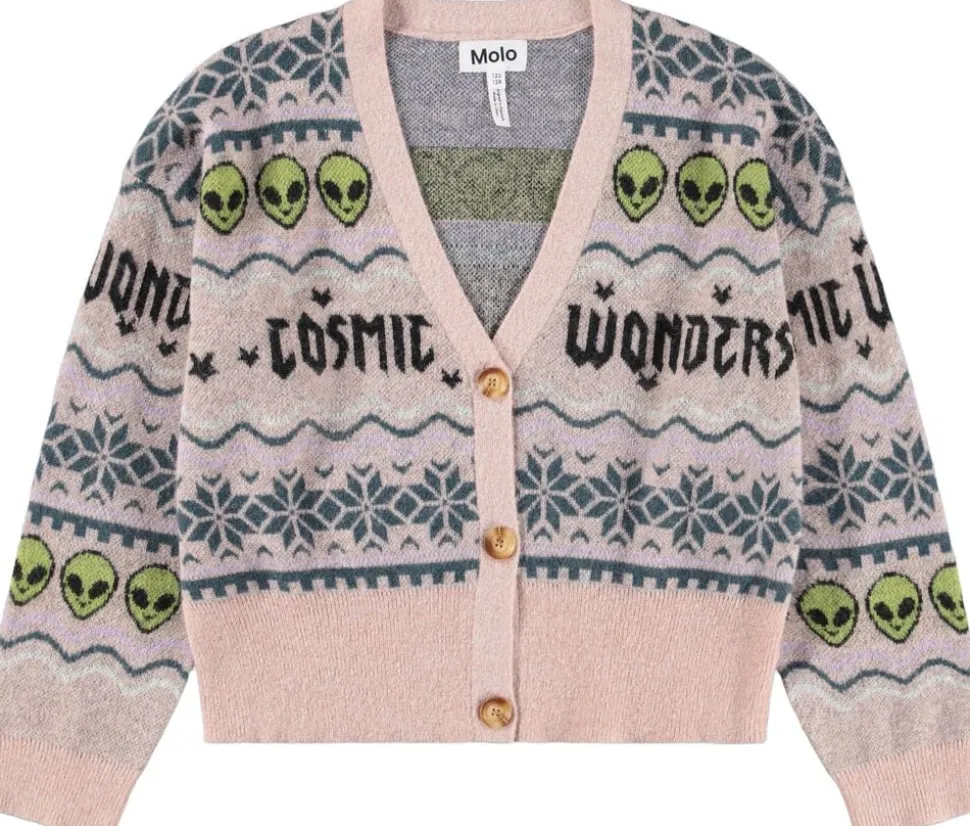 Denne flotte cardigan fra Molo er lavet i en blanding af uld og alpaka. Den har et farvestrålende mønster inspireret af nordisk strikkehistorie med små alien og teksten ‘Cosmic Wonder’. Cardiganen har V-udskæring, ribafslutning og fine knapper foran.