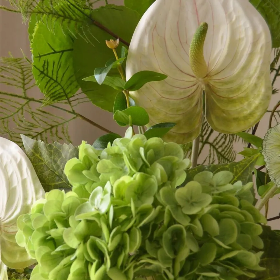 Denne buket indeholder en harmonisk blanding af bløde grønne og naturlige teksturer, der skaber en frisk og fredfyldt sammensætning. Svampehydrangeablomster tilføjer fylde, mens skulpturelle anthurier og delikate frøplanter introducerer raffinerede detaljer. Flowing amaranthus og luftige bregner bringer bevægelse, suppleret med struktureret løv til dybde. Denne buket indeholder i alt 10 stilke. Bourquetten når en højde på 85 cm på sit højeste punkt, men alle stilke kan let bøjes og justeres for at opnå den ønskede højde og form til ethvert arrangement. Den store keramiske jordvase på billedet måler 30,5 cm i højden og 10 cm i diameter.