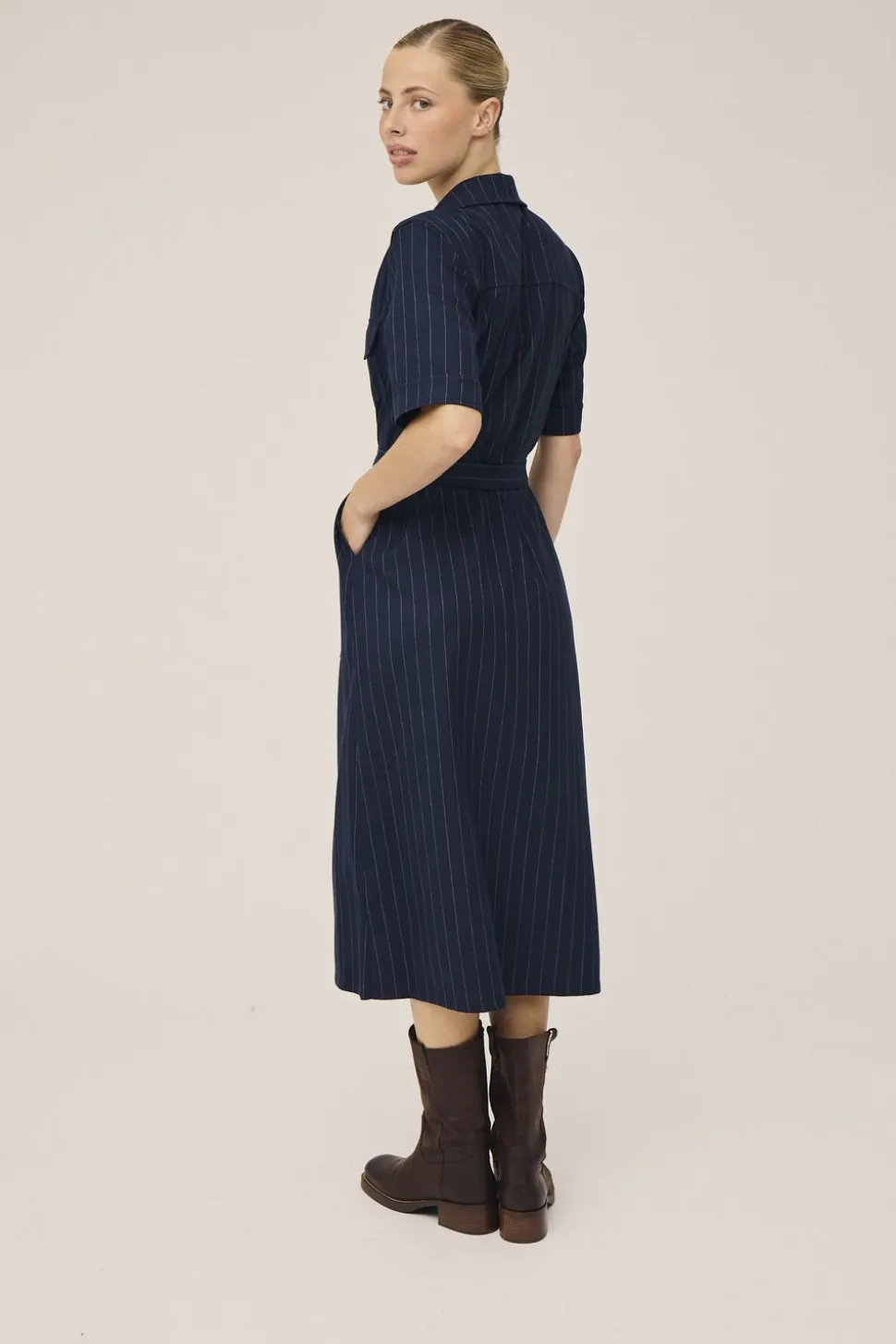 Skjortekjole fra Magasin du Nord Collection i den lækreste kvalitet af 63% genanvendte fibre med GRS-certificering. Kjolen har et fint, nålestribet print, hornknapper på fronten, korte ærmer, en åben krave, brystlomme, sidelommer samt et bindebånd i taljen. En skøn skjortekjole i en lækker kvalitet.