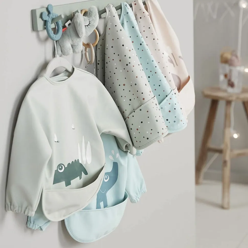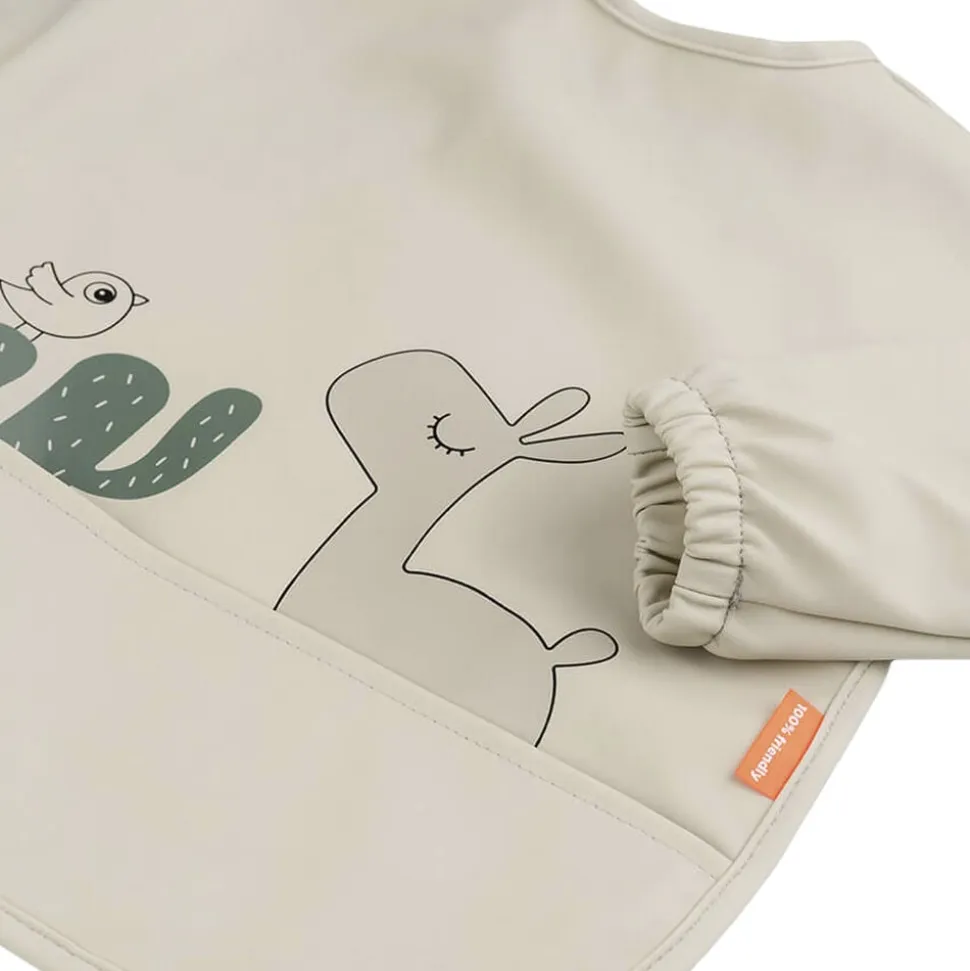 Hagesmækken med lange ærmer og en lomme vil beskytte dit barns tøj ved spisetid eller når I leger med maling, modellervoks eller andre kreative sager. En justérbar dobbelt-lukning sikrer, at hagesmækken passer til både babyer og tumlinger. Den bløde hagesmæk er vandtæt og har praktiske ærmer med elastik, der holder de små tørre. Den er nem at tørre af og holde ren, hvilket sparer dig for en masse vasketøj. Den søde sandfarvede hagesmæk er dekoreret med Lalee og en sjov kaktus.