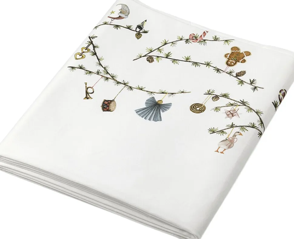 Kählers klassiske hvide Hammershøi-stel har fået en smuk juledug. Dugen er dekoreret med nostalgiske jule-elementer som nøddeknækkere, trommer, snemænd og julehjerter, mens den grønne lærkegren skaber en kontinuitet i designet. Hammershøi Juledug byder julen velkommen med en samling af de kendte illustrationer fra det populære julestel. De fine, detaljerede julemotiver er skabt af kunstneren Rikke Jacobsen, som med sin karakteristiske streg fortæller små historier med bl.a. kræmmerhuse, engle, valnødder, fugle, kogler og stjerner.