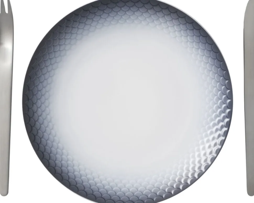 Kanten på HAV tallerkenen er omkranset af en sofistikeret dekoration, som er sprøjtemalet på i et drømmende spil af de grøngrå farver af havets dis. Farverne flyder over subtile fiskeskæl og indrammer på smukkeste vis den serverede mad og skaber en organisk, levende taktilitet til ethvert måltid. Den særlige dybde i kanten på hvert fiskeskæl understreger HAV middagstallerkenens funktionalitet og skønhed.
