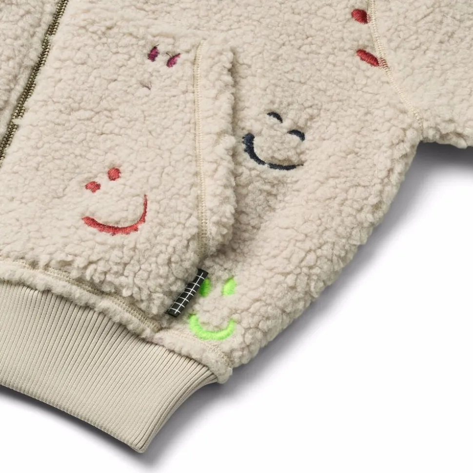 Denne beige fleecejakke fra Molo er lavet i genanvendt polyester med broderede farverige smilende ansigter. Jakken er oversize, har en praktisk lynlåslukning, matchende ribkanter og frontlommer. Den har et blødt og glat bomuldsfoer, der gør den behagelig at have på.