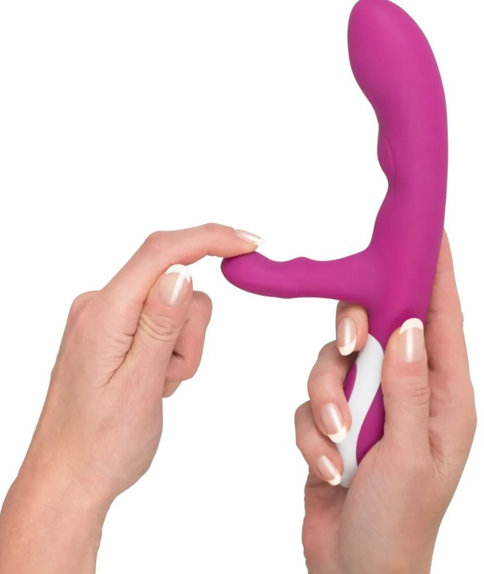 Lad dig forkæle af denne ekstravagante lover og dens ekstraordinære funktioner. Den lillafarvede vibrator med klitorisarm råder nemlig over to motorer der giver mulighed for både vaginal og klitoris stimulering! Den ene motor befinder sig i skaftet, den anden i armen. Begge råder over 5 vibrationsmodi der styres separat. Men det bedste ved det hele er, at skaftens spids kan opvarmes: Når vibratoren tændes opvarmes spidsen til 42 °C. Genopladelig med medhørende USB-ledning.