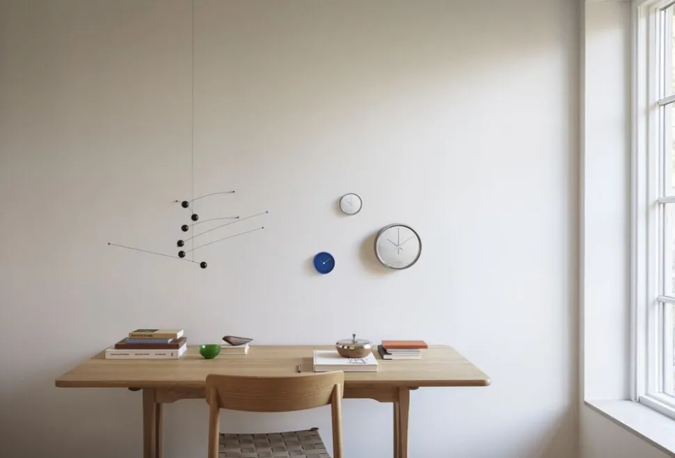 Koppel væguret blev introduceret i 1978 og er et tidløst stykke dansk design af Henning Koppel. Det kombinerer form og funktion på en elegant måde og byder på nøje overvejede detaljer: Små prikker markerer timer og minutter, en lydløs indvendig mekanisme sikrer et stille urværk, og unikke, aflange visere strækker sig ud over midten ikke kun som modvægte, men som et bevidst æstetisk valg.
