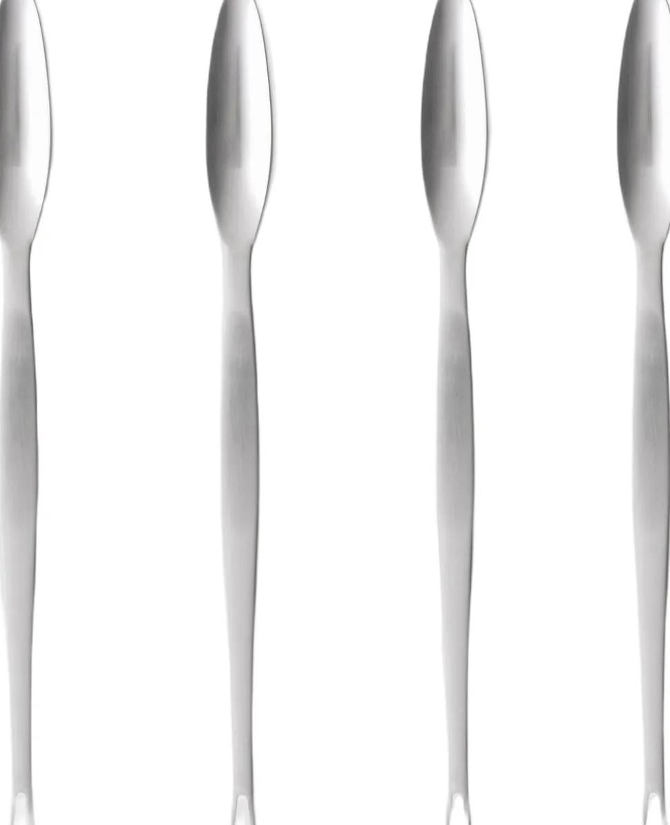 En flot og elegant hummer- og skalddyrsgaffel. Udført i matpoleret rustfrit stål i en gaveæske, som indeholder 4 stk. En slank gaffel med et aflangt laffet i den ene ende og to tænder i den anden. Det perfekte redskab, til at få kødet ud af klør, ben, skald og andre små steder på hummere, krabber og andre skalddyr.