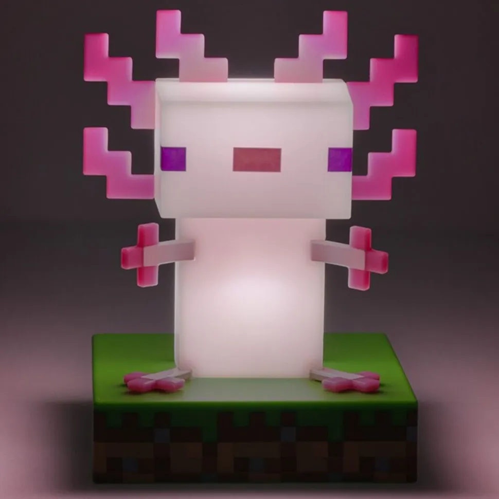 Bring det akvatiske hulebiom ind i dit hjem med denne Axolotl Icon-lampe. Den 11 cm høje lampe er formet som de lyserøde, kantede axolotl-mobs fra Minecraft. Når du tænder den, spreder den et varmt lys i rummet. Lampen drives af 2x AAA-batterier (medfølger ikke). Axolotl Icon-lampen er en fantastisk lysskabende tilføjelse til ethvert gamerhjem.