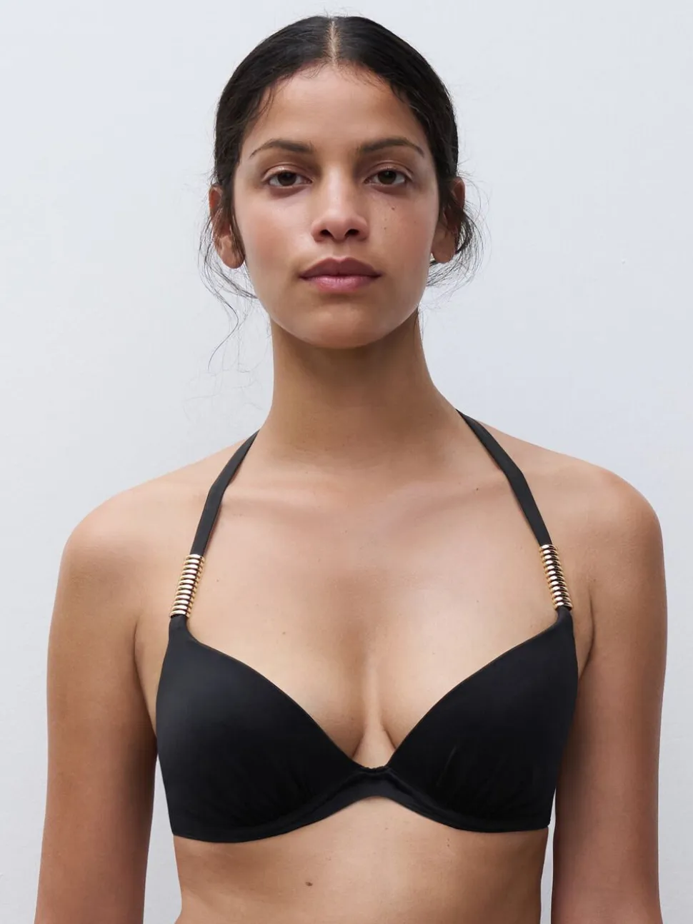 Bikinitop fra Icon-serien fra Chantelle, perfekt til den moderne kvinde, der gerne vil føle sig både stilfuld og godt tilpas ved vandet. Denne bikinitop er designet til at give dig den perfekte balance mellem funktion og mode, med nøje udvalgte detaljer, der virkelig gør en forskel. Bikinitoppen er pyntet med gyldne Zamac-tilbehør, der ikke bliver varme i solen. Disse detaljer tilføjer et elegant touch, der vil få dig til at skille dig ud på stranden eller ved poolen. Med en formende foring og lægeffekt foran får du en flatterende silhuet.