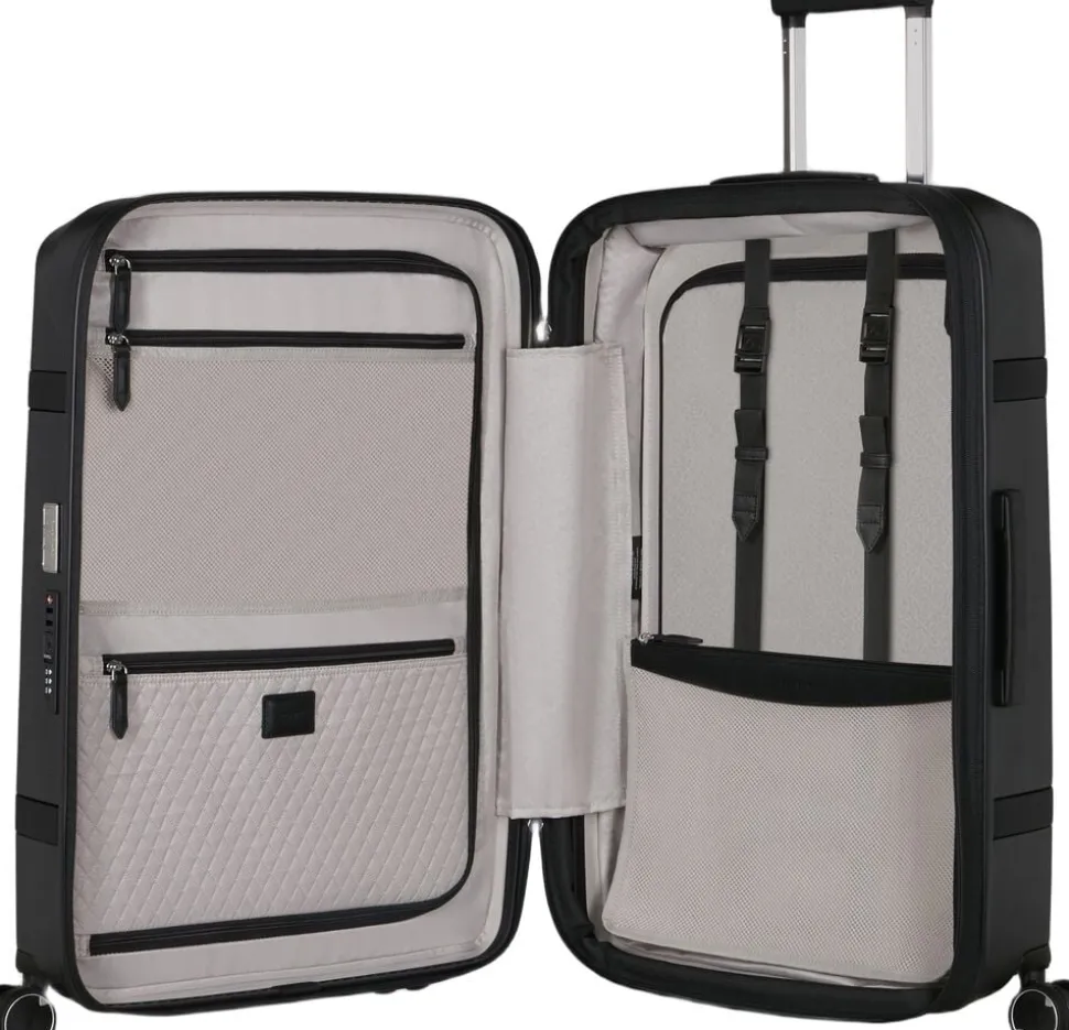 Elegant kuffert med PU detaljer, mulighed for udvidelse, polycarbonat, 4 hjul, TSA lås , indvendig stofforring lavet af genbrugte plastflasker, mulighed for personalisering med de medfølgende stickers, dobbelt trollystativ, navneskilt, vægt 3,8 kg,rumindhold 79/86 l, 5 års garanti,69x45x28/31 cm.