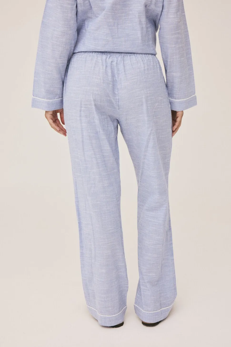 Bukser fra Magasin du Nord Collection i en blød og lækker 100% bomuldskvalitet med smalle striber. Bukserne har en løs pasform med elastik i taljen og bindebånd på fronten. Derudover har de praktiske lommer i siderne samt brede kanter forneden med pipingbånd. Kombiner dem fx med en overdel fra Magasin du Nord Collection for et komfortabelt og luksuriøst natsæt.