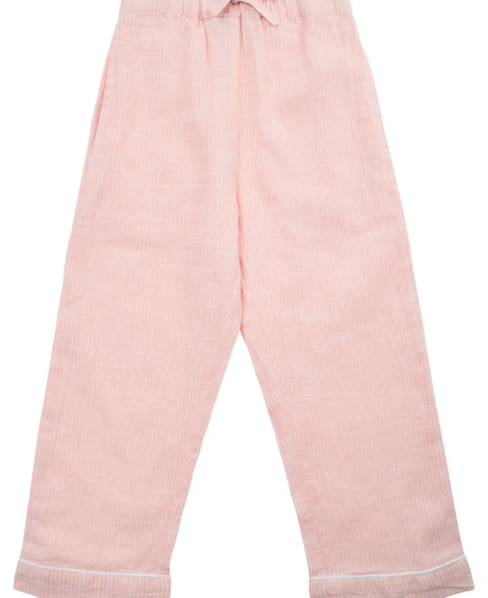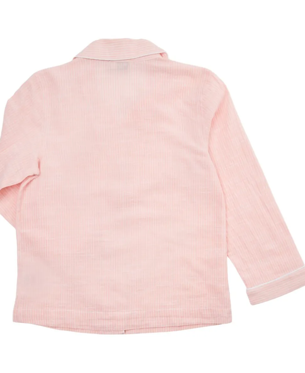 Pyjamas fra Magasin du Nord Collection i den blødeste kvalitet af 100% økologisk bomuld med GOTS-certificering. Sættet består af en langærmet skjorte og et par bukser med et fint, stribet mønster, ’piping’-detaljer samt en løs pasform. Bukserne har sidelommer samt elastik og snøre i taljen. Skjorten har en enkelt brystlomme, en åben krave samt knaplukning på fronten. En skøn pyjamas i den absolut lækreste kvalitet.