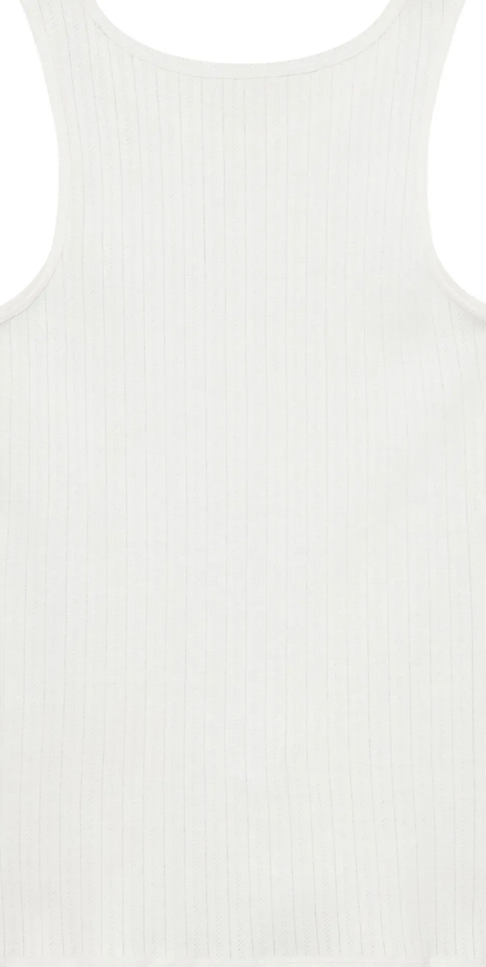 Smuk og enkel pointelle top i 100% økologisk bomuld. Toppen har rund hals og hulmønster, samt indvendige syninger med franske sømme for en delikat, luksuriøs finish. Brug toppen som et ekstra lag og lad gerne kanten stikke frem, så man kan se mønsteret. Toppen kan også bruges under en åbenstående blazer eller skjorte, som en del af et feminint og afslappet look.