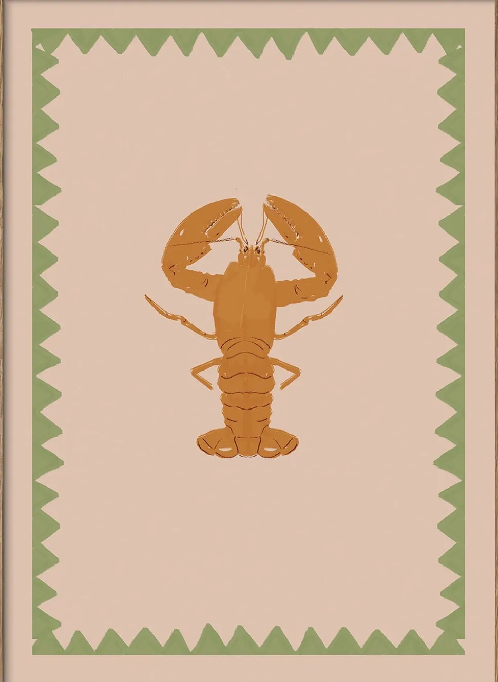 Giv dit hjem et strejf af kystnære charme med denne livlige hummerplakat. Med en dristig orange hummer mod en blød ferskenbaggrund indrammet med en zigzag grøn kant, tilføjer dette kunstværk en legende og nautisk stemning til ethvert rum. Perfekt til fiske- og skaldyrselskere og strand-tema indretning. *Stel sælges separat.
