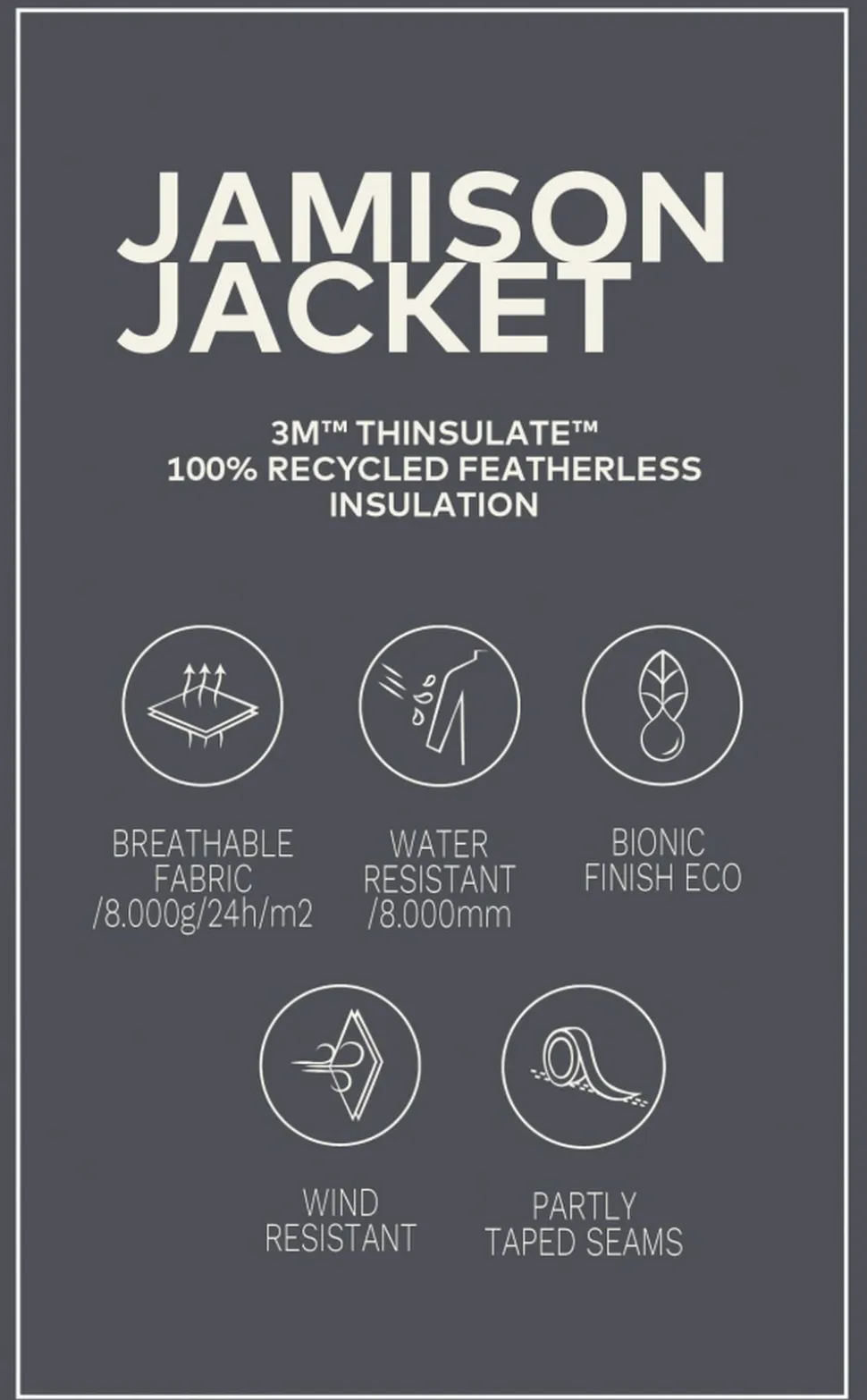 Vi introducerer Jamison vinterparkaen – den perfekte ledsager til at tackle vintervejret med stil. Denne hybridparka er designet med en stilfuld puffer på ryggen og har 8000 mm vandafvisende stof, der holder dig tør, når du er på farten. Stoffet er åndbart, hvilket gør det behageligt at have på selv under anstrengende aktiviteter i koldt vejr. Derudover er parkaen vindtæt og har Bio finish eco-teknologi for at sikre optimal vejrkontrol. Når du har lynlås, er der en indvendig lomme med lynlås, så du nemt kan opbevare dine mindre ejendele samt to brystlommer med lynlås og to forlommer. Isolering er 3M Thinsulate fjerfri, fremstillet af Recycled. Jamison er virkelig en fantastisk vinterjakke. Modellen bærer en størrelse L 188 cm høj.
