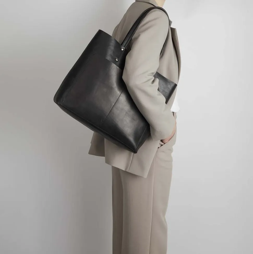 JaydaMBG Shopper fra Markberg. Tasken er i vegetabilsk indfarvet læder, baseret på naturlige materialer. Lækker taske med to lommer på fronten. Tasken har lynlåslomme indvendig og lukkes med magnet. To skulder hanke. Ingen indvendig for.