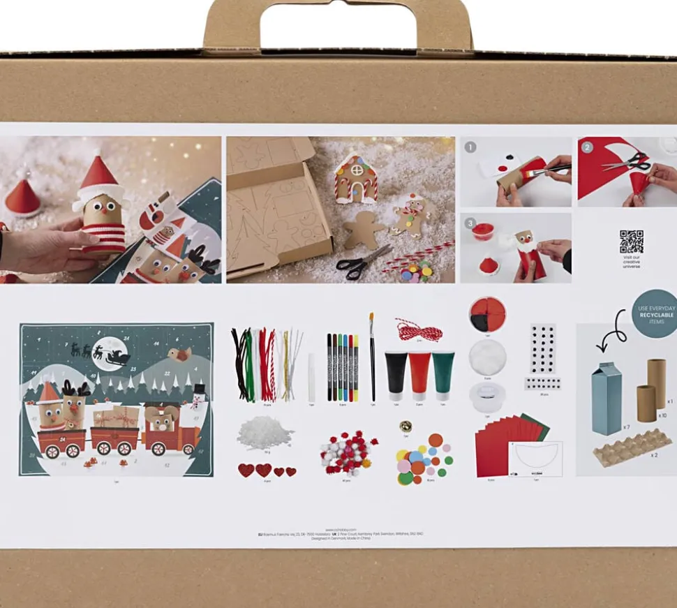 Tæl ned til jul med 24 krea-projekter af genbrug, og skab et unikt vinterlandskab. Kalenderen indeholder al den vejledning I behøver. For børn og voksne er adventskalendere og julekalendere noget af det bedste ved julen. Det skaber en forventningsglæde i december og de fleste elsker glæden ved de små overraskelser, som venter på en. En julekalender er nemlig en påmindelse om, at julen nærmer sig, og en adventskalender er med til at gøre hver søndag i advent ekstra særlig. Med denne julekalender får børnene en vaskeægte genbrugsjul. Kalenderen har 24 låger og hver låge gemmer på et sjovt, nyt genbrugsprojekt. Gå på jagt efter æggebægere, mælkekartoner og toiletruller og giv det nyt liv med de kreative materialer, der medfølger. Resultatet blive den fineste vinterlandskab, som vokser sig større dag for dag.