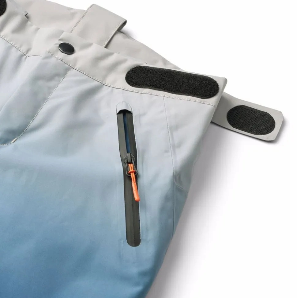 Disse blå overtræksbukser fra Molo er lavet i genanvendt polyester. Bukserne har trykknap- og lynlåslukning, udvendige, justerbare velcro-stropper, bælte stropper til Molos seler (ekstra tilbehør), justerbar benåbning med snefang og ekstra forstærkning mellem benene. Der er vandtætte lommer, refleks bagpå, fleece foret udsatte steder og vatteret med 3M Thinsulate.