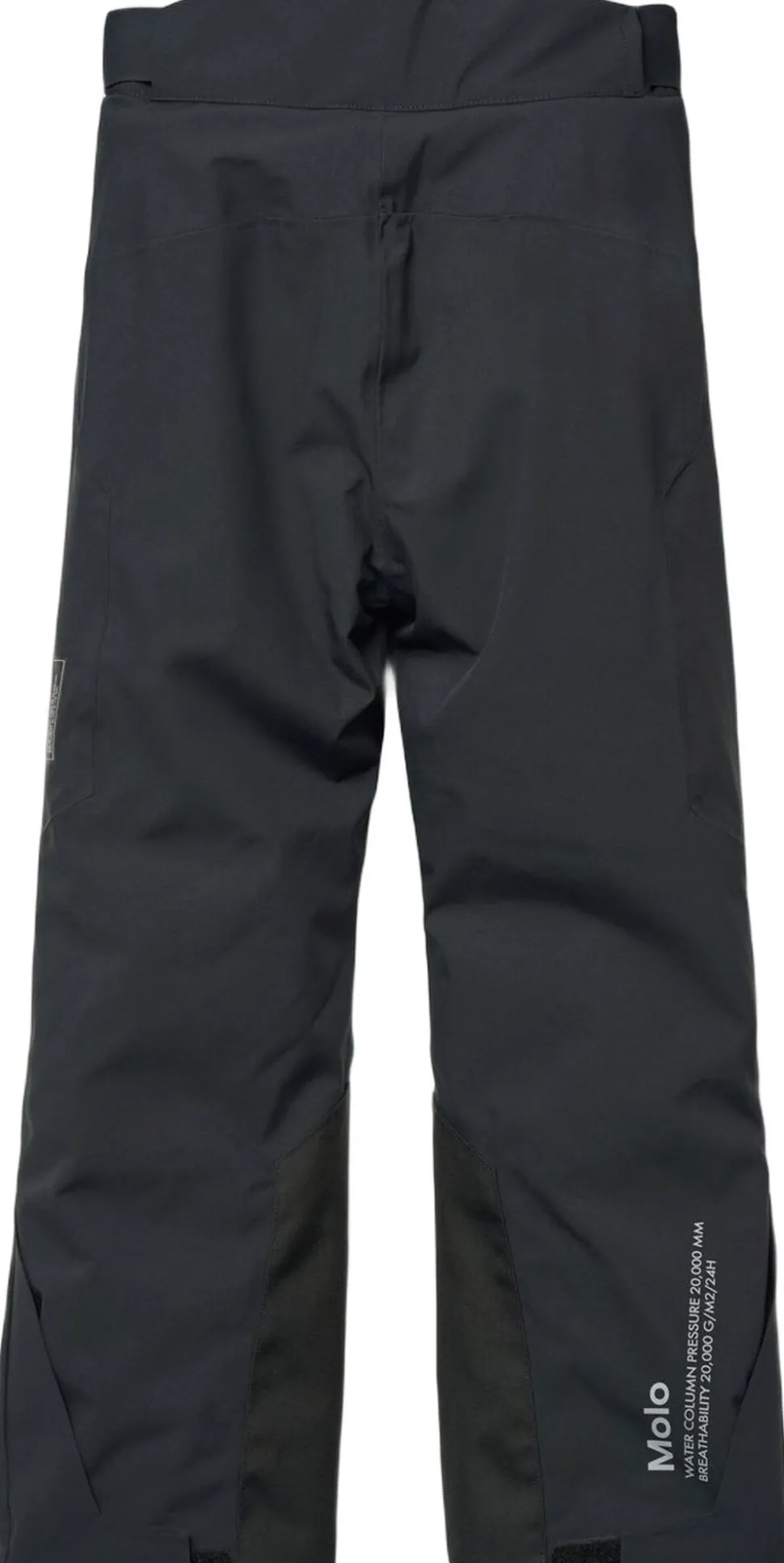 Disse sorte overtræksbukser fra Molo er lavet i genanvendt polyester. Bukserne har trykknap- og lynlåslukning, udvendige, justerbare velcro-stropper, bælte stropper til Molos seler (ekstra tilbehør), justerbar benåbning med snefang og ekstra forstærkning mellem benene. Der er vandtætte lommer, refleks bagpå, fleece foret udsatte steder og vatteret med 3M Thinsulate.