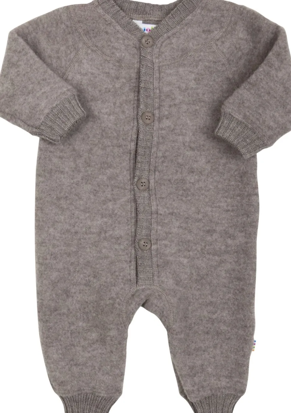 Heldragt. Lukkes foran med knapper. Ribkant i hals, knaplukningen, ærmer og ben. En kraftig børstet uldkvalitet som er ekstra blød. Brug dragten i autostolen eller barnevognen. Ensfarvet. Pure merino wool og Oeko-tex 100 mærket.