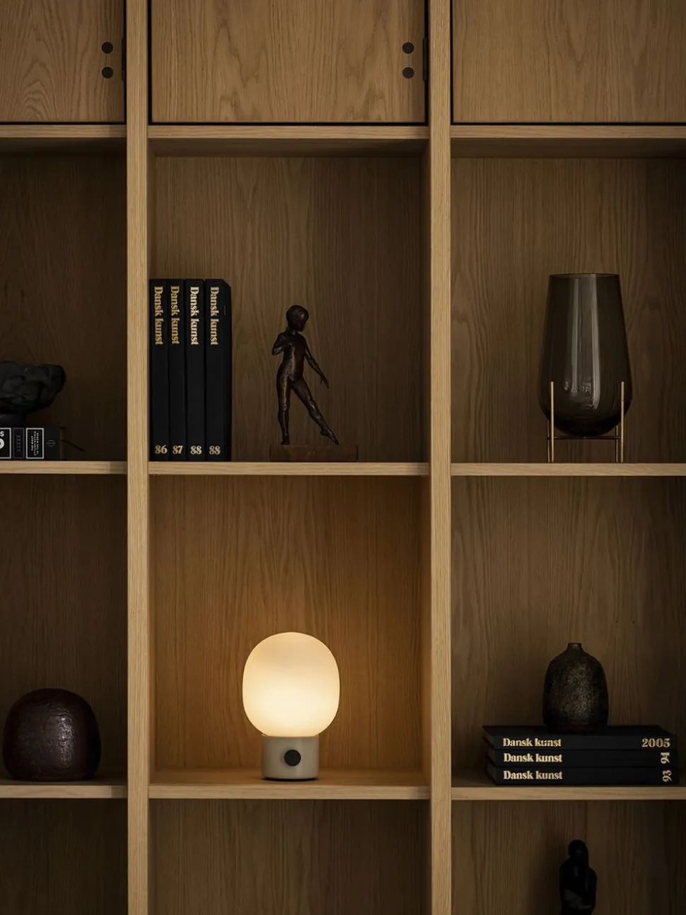 Our classic JWDA Lamp in a cordless version. Inspired by traditional oil lamps and crafted in contrasting materials, the JWDA Portable has the freedom and flexibility to move anywhere you want. Delivering 10 hours of adjustable light when fully charged, the small-scale design is defined by its elliptical glass shade and solid metal base with a brass dimmer switch. It features a USB charger at the base, for standard sockets as well as Audos Charging Board, which reanimates multiple devices in a single sitting.