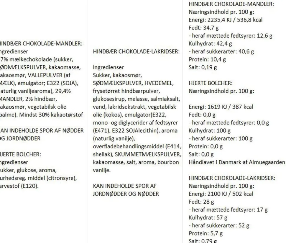 Gaveæsken indeholder en pose hjerte bolcher med smag af kirsebær, en pose sød lakrids rullet i hvid chokolade og hindbær, samt en pose mandler rullet i mælkechokolade og hindbær – Tre generationer har indtil nu været i gang med kogning af de søde ting og sager på almuegaarden, hvor gode råvarer, naturlige ingredienser, og ikke mindst det gode danske håndværk holdes i hævd.