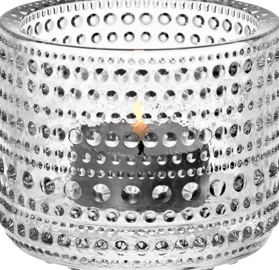 Det finske navn ‘dugdråbe’ refererer til cirklerne af bobler i det pressede glas. Med inspiration fra finsk natur glimter dugdråberne som en perlerække på græsset i morgensolen. Oiva Toikkas kærlighed til at eksperimentere har ført til udviklingen af et helt nyt dråbedesign til Kastehelmi. Overfladestrukturen fremhæver glassets lenvende, reflekterende skønhed.