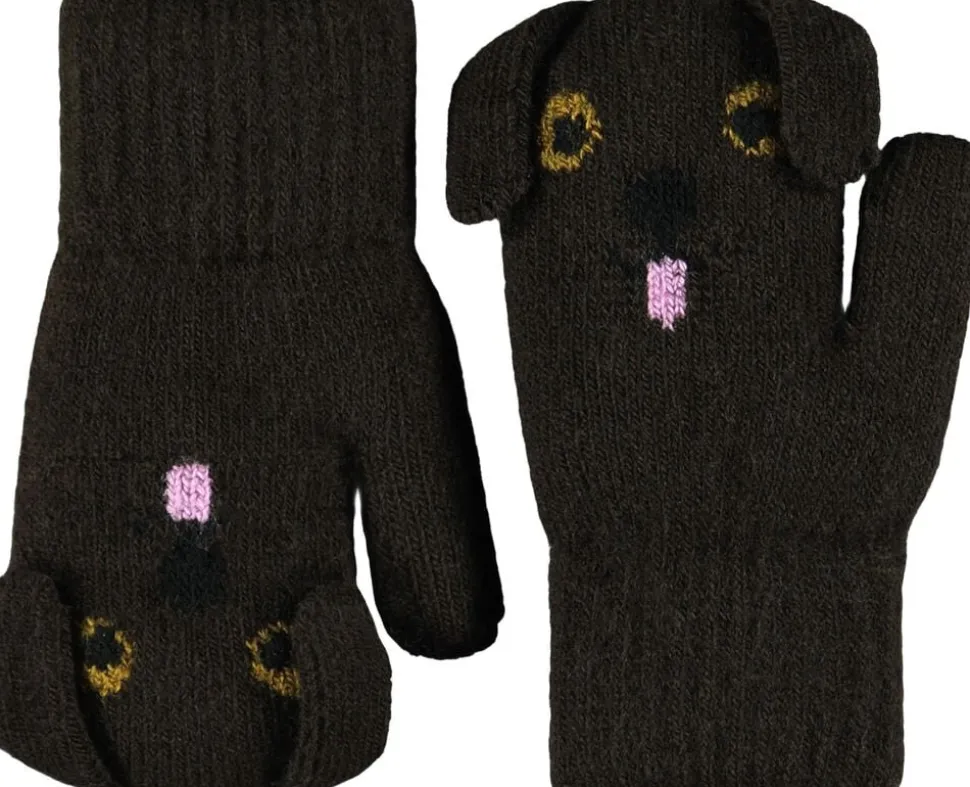Brune strikvanter fra Molo med bamseansigt. Vanterne har en ribkant ved håndleddet og et blødt fleecefor, der holder hænderne varme.