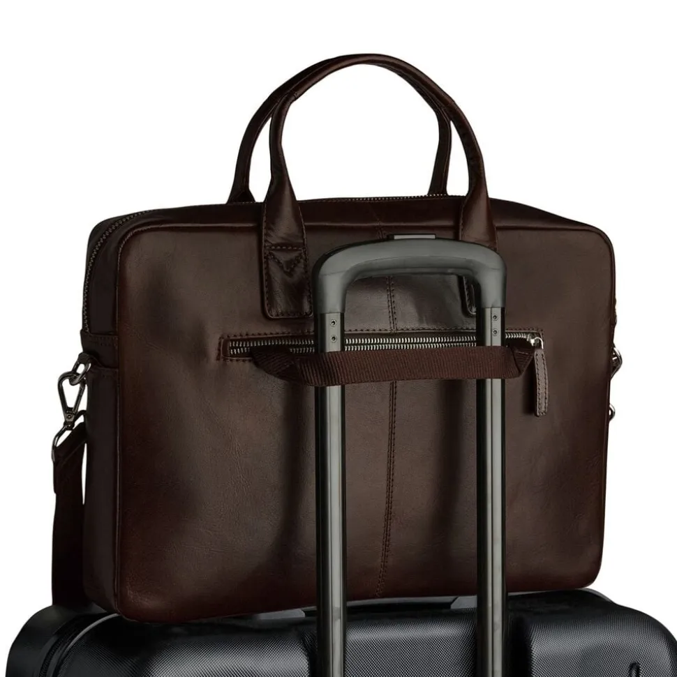 Knox Laptop Bag fra Markberg Man er en elegant og tidløs computertaske i 100% Buffalo leather. Designet kombinerer funktionalitet og eksklusivt håndværk ideel til både kontoret og rejser. Kvaliteten er LWG-certificeret og er en del af vores Zero Waste, hvor intet skind går til spilde i produktionen. Læderets struktur og nuance kan variere naturligt og giver et unikt udtryk. På fronten har tasken en god stor lynlåslomme, med plads til mindre ejendele. Taskens har ét stor hoved rum. Her er der plads til diverse dokumenter og andre ting, du har med på farten. I den ene side er der en åben lomme, samt 2 rum til kuglepinde, samt en lynlåslomme. Ved den anden side der et polstret rum, der er tiltænkt til din 14 eller 15′ computer. Lommen åbnes med et læder og velcro stykke, som holder ekstra godt på din computer. Under den er der plads til dokumenter eller en IPad. Hoved rummet lukkes med lynlås. Bagpå tasken er der en lynlåslomme, med en luggage strap der kan tages frem. Perfekt til at have på din kuffert, når du er på farten og ude og rejse. Tasken har to gode bærehanke, samt en aftagelig og justerbar skulderrem, så den kan bruges på flere måder. Taskens hardware er i metal, som er belagt og så er det nikkelfri. Taskens slidstærke for er i 100% polyester og så måler tasken 41 cm x 29 cm x 7,5 cm.