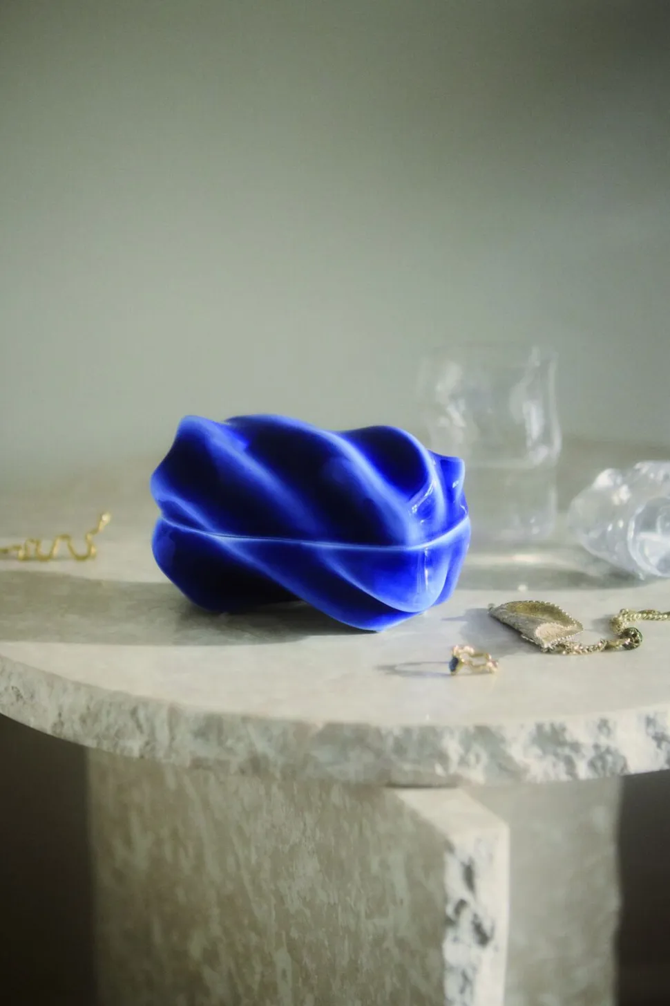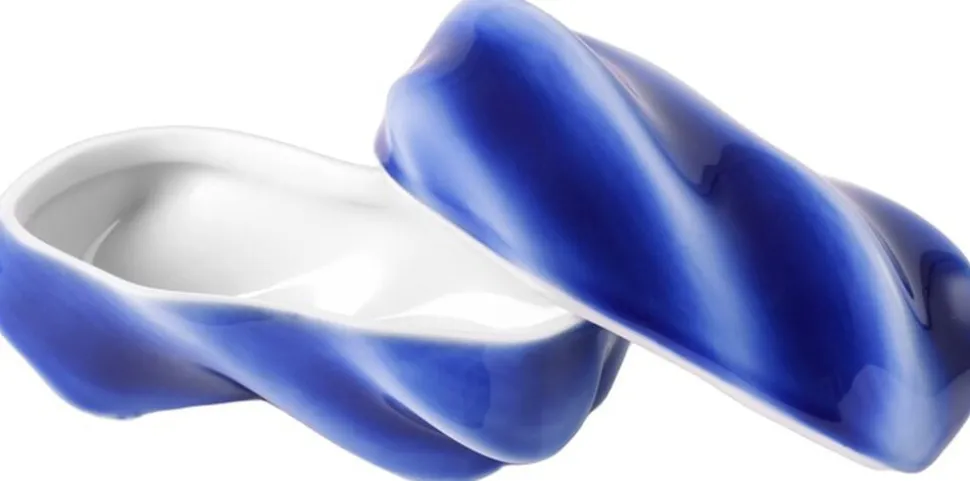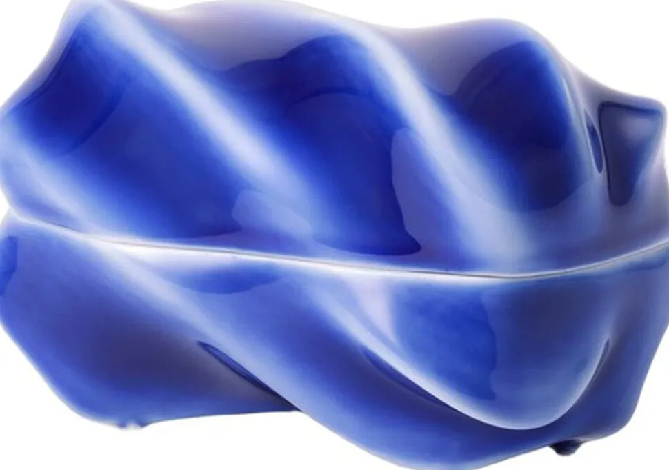 Med sin næsten usynlige åbning er Kontur-bonbonniere et lille kunstværk, som bevarer små hemmeligheder og skatte under en nøje udarbejdet overflade af rullende bølger. Farven er sprøjtemalet i hånden, hvilket giver en utrolig dybde til de blå nuancer og samtidig betyder, at der ikke findes to Kontur-bonbonnierer, der er fuldstændig ens.