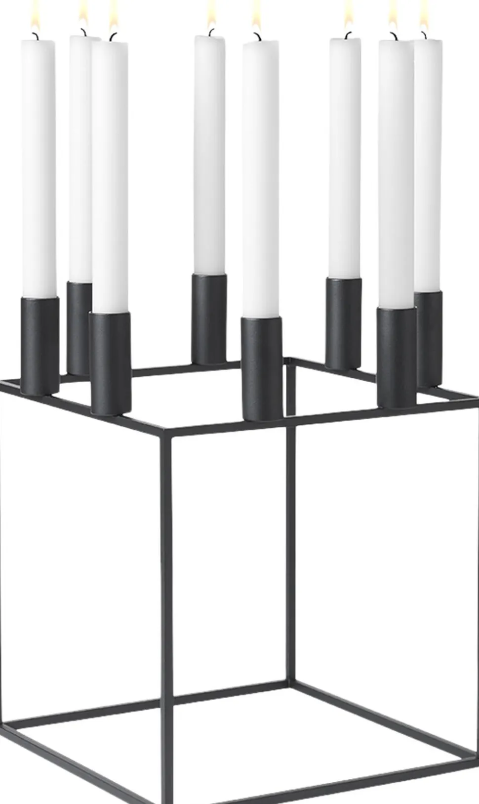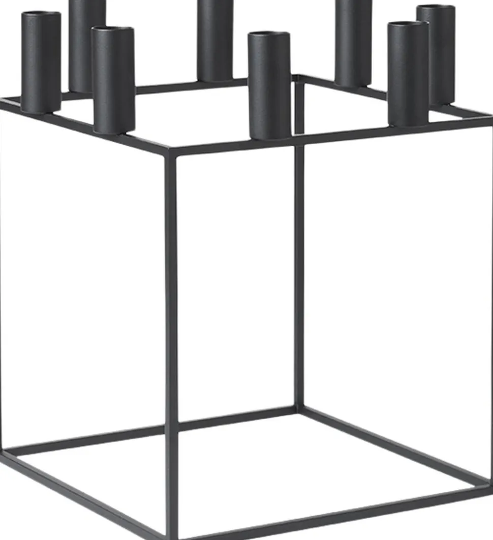Kubus 8 lysestagen i sort er fremstillet i støbejern og tegnet af Mogens Lassen i 1962. Lysestagen fås i hvid, sort, bruneret kobber, nikkel samt messing. Med skarp fornemmelse for nutidens funkisstil designede Mogens Lassen i 1962 de ikoniske Kubus lysestager, dengang forbeholdt familien og de nærmeste arkitektvenner. Kubus fremstilles fortsat i Danmark, og har blandt arkitekter og designelskere opnået status som et moderne internationalt designikon. Rengøring: Vend stagen med lyseholderne ned ad, og placer den på en bageplade med bagepapir stående på lyseholderne. Sættes i en 75 grader varm ovn i 15-20 minutter. Stagen tørres herefter af med en fugtig klud. NB! Brug aldrig skarpe genstande eller kogende vand til at rengøre lysestagen med. Vi anbefaler, at du ikke lader lysene brænde helt ned i stagen, da dette kan medføre misfarvning eller skader på lakeringen.