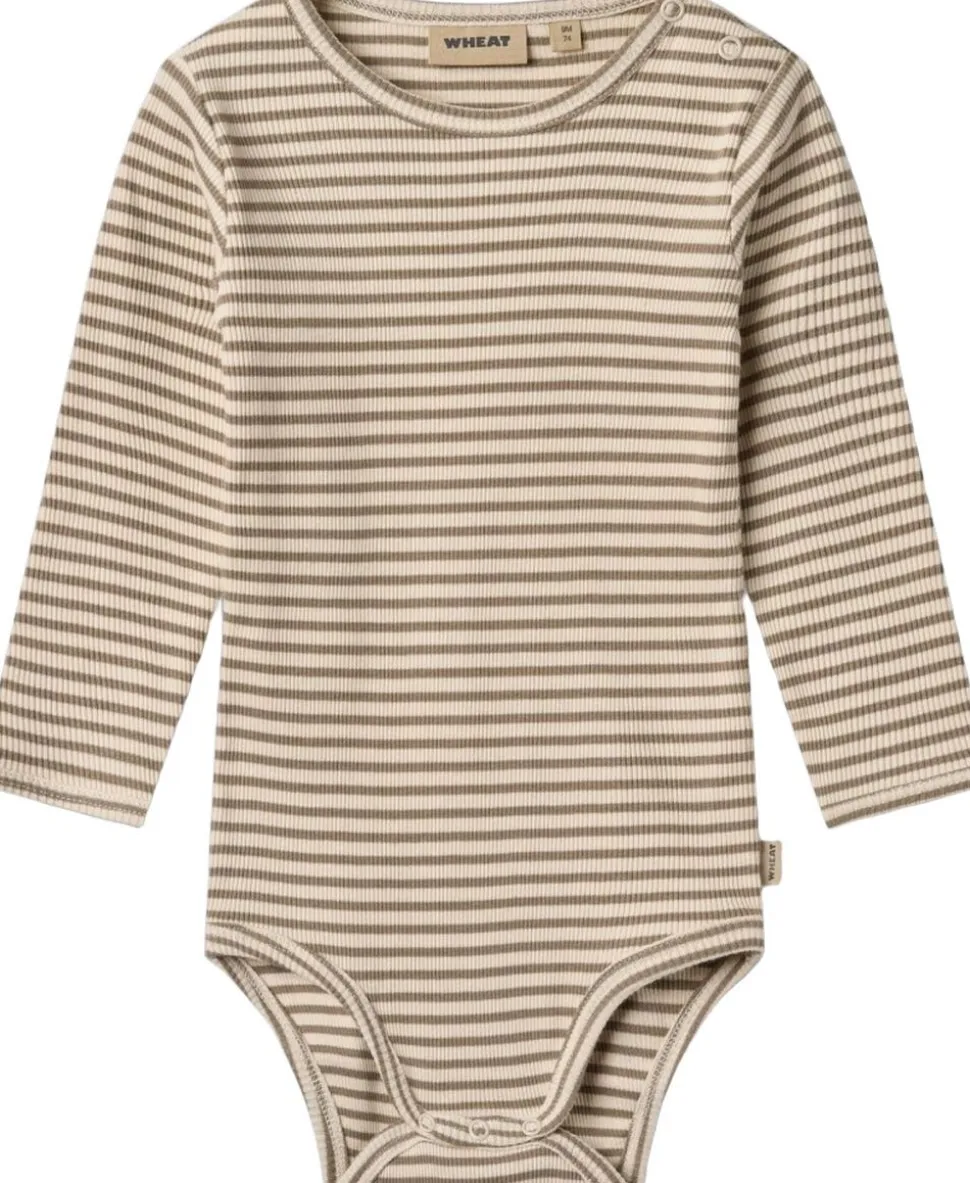 Langærmet rib body med striber i blødt økologisk bomuld til din baby. – Ribstruktur – Tæt pasform – Kontrastfarve ved alle åbninger – Trykknapper på den ene skulder – Trykknapper i bunden ved benene – Stribet Wheats basis body er en sand klassiker i garderoben, når det kommer til småbørn. Denne body har trykknapper på den ene skulder samt i bunden for bedre komfort, når du skal klæde dit barn på. Brug bodyen som den inderste del i ethvert outfit, da den er blød at have tæt på huden. — – Standard 100 af OEKO-TEX® – 100% Økologisk bomuld – GOTS certificeret