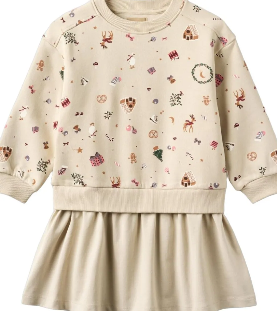 Langærmet sweatkjole i blødt økologisk bomuld til børn. – Løs pasform – Blød rib ved halsudskæring, manchetter og forneden – Lav skuldersøm – Bærestykke ved hoften – Ekstra stof som nederdel – Wheat signatur juleprint Wheats søde kjole har en løs pasform, som gør den nem og behagelig for dit barn at have på. Kjolen er perfekt til efterårs- og vintermånederne og kan styles med bløde strømpebukser og en cardigan eller strik udover. — – Standard 100 by OEKO-TEX® – 100% Økologisk bomuld – GOTS certificeret