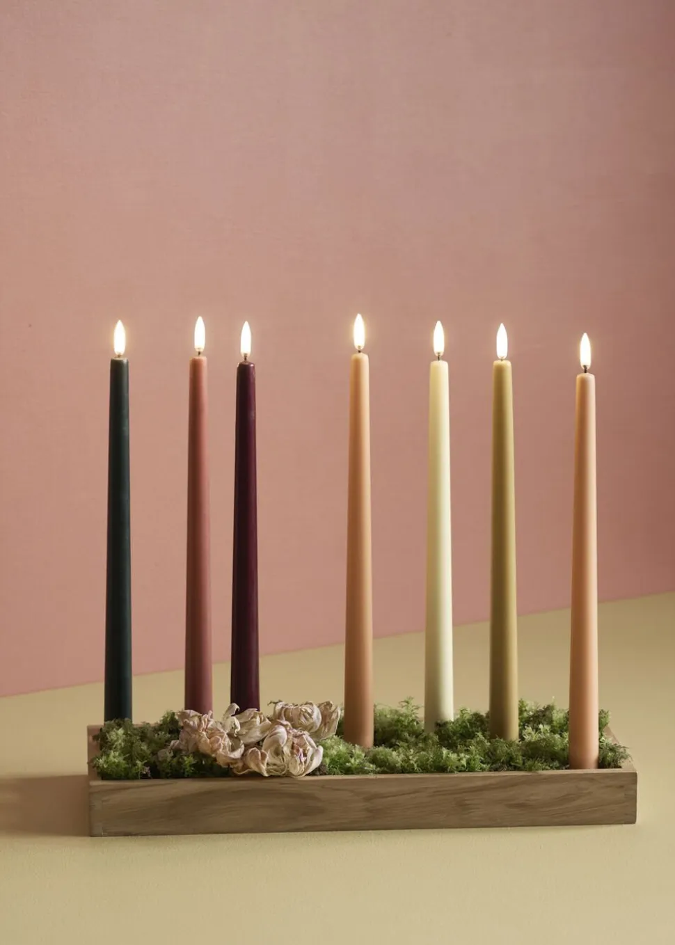 De enkle og elegante LED Taper Candle stearinlys er designet af Uyuni. De traditionelle stearinlys er fremstillet af paraffinvoks. Idéen bag LED Taper Candle var, at designe et stearinlys, hvor man fjernede risikoen for de kemiske forbindelser, der bliver frigivet under en normal forbrændingsproces. LED Taper Candle er genskabt med de samme grundprincipper for formål og design, og er derfor lavet i LED, der har 3 dæmpnings muligheder, samt 4 timer indstillinger: 4, 6, 8 & 10 timer. Stearinlysene sælges i én pakke af to stearinlys.