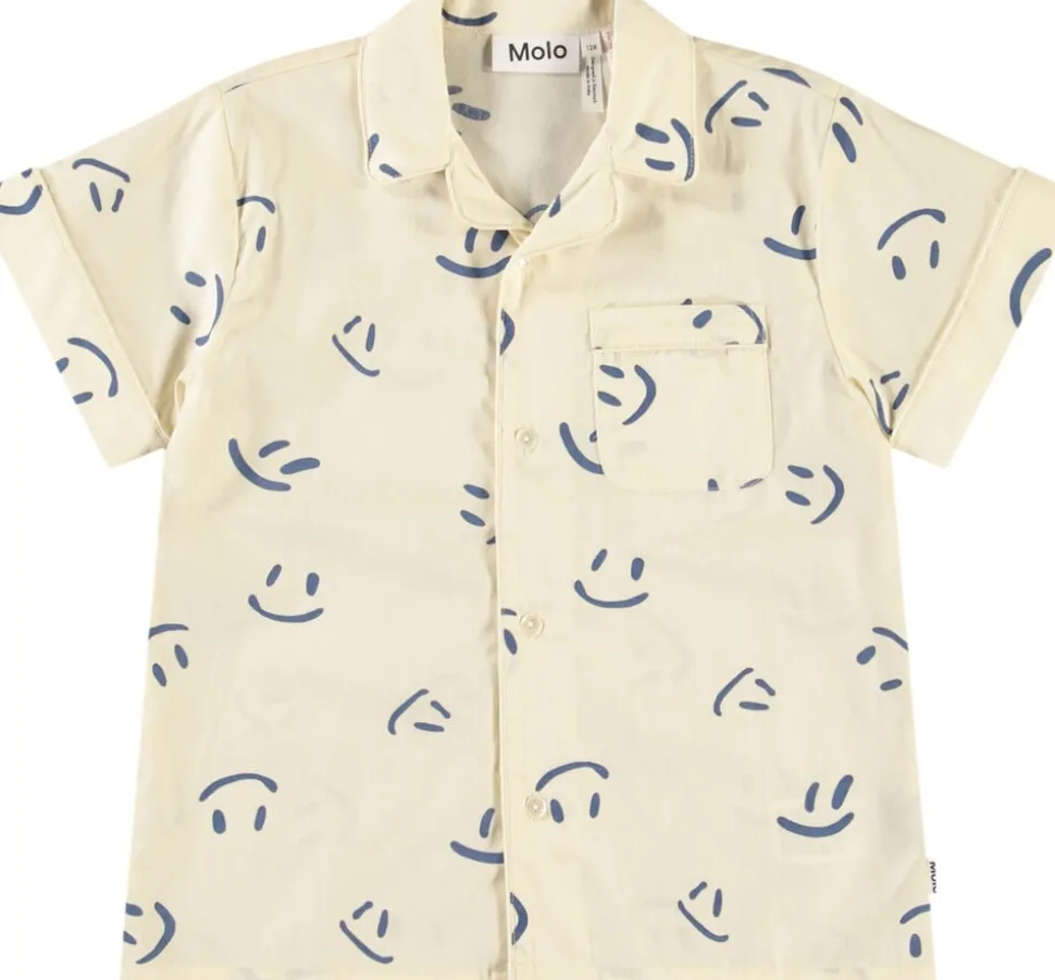 Råhvidt pyjamas-sæt med korte ærmer og ben i økologisk bomuld. Skjorten har en løs pasform, en krave med knapper ned langs fronten, en brystlomme og ombuk ved ærmerne. Shortsene har også en løs pasform, går til midt på låret og har elastik samt snøre i taljen. Sættet prydes af et allover print af smilende mørkeblå ansigter.