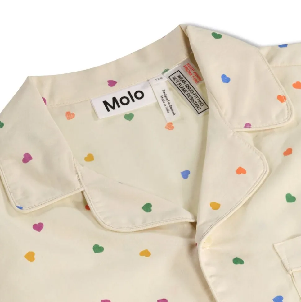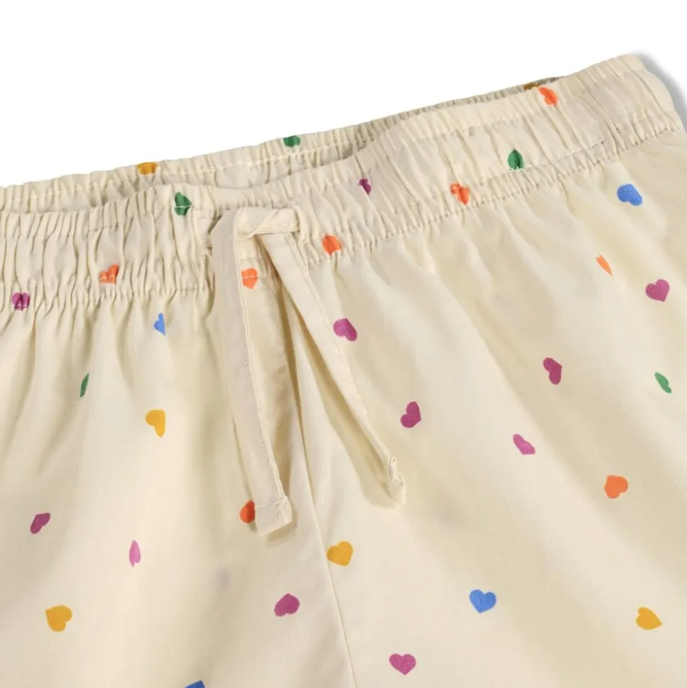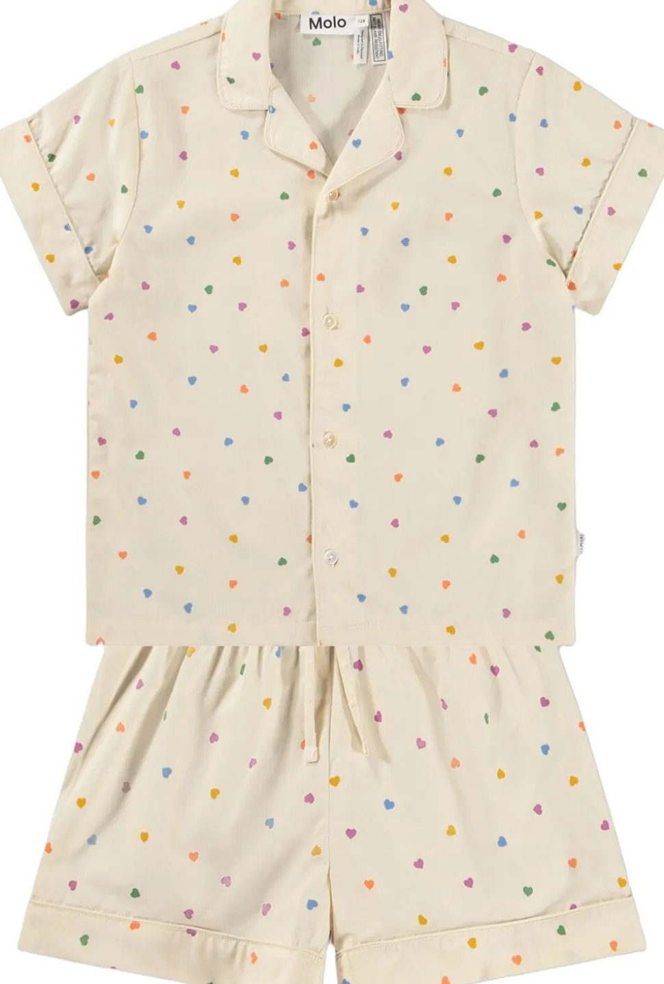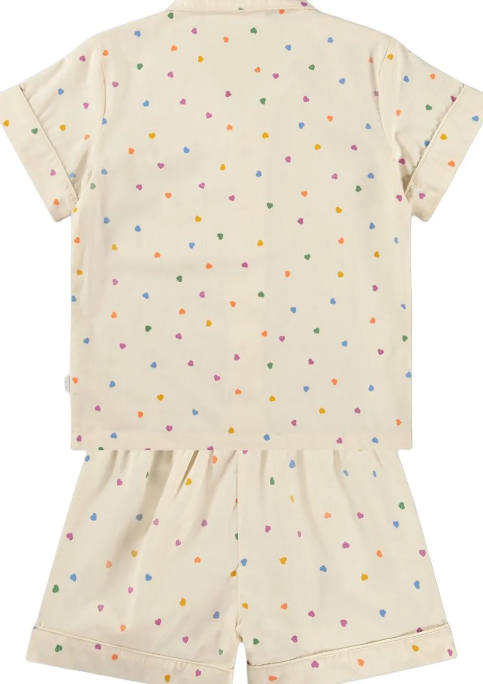 Denne todelte pyjamas i blød bomuld tilbyder komfort og stil. Den korte ærmelige skjorte med krave og knapper komplementeres af shorts med elastik og snøre i taljen, hvilket sikrer en god pasform under leg og søvn. Det livlige print af små hjerter tilføjer et legende element, der gør sætning til en sjov favorit for både børn og forældre. Perfekt til varme dage.