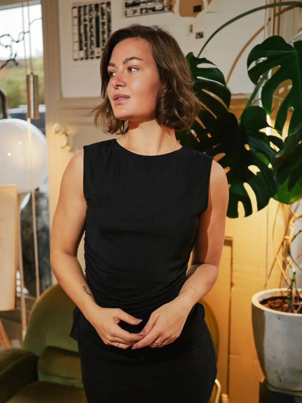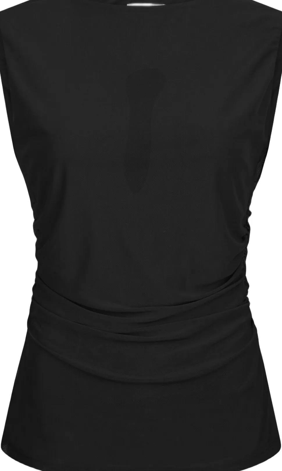 Ærmeløs mesh top. Toppen har en rund halsudskæring, draperede detaljer og en fastsyet undertop, så den ikke er gennemsigtig. Den har en tætsiddende pasform. Modellen er iført størrelse 36.