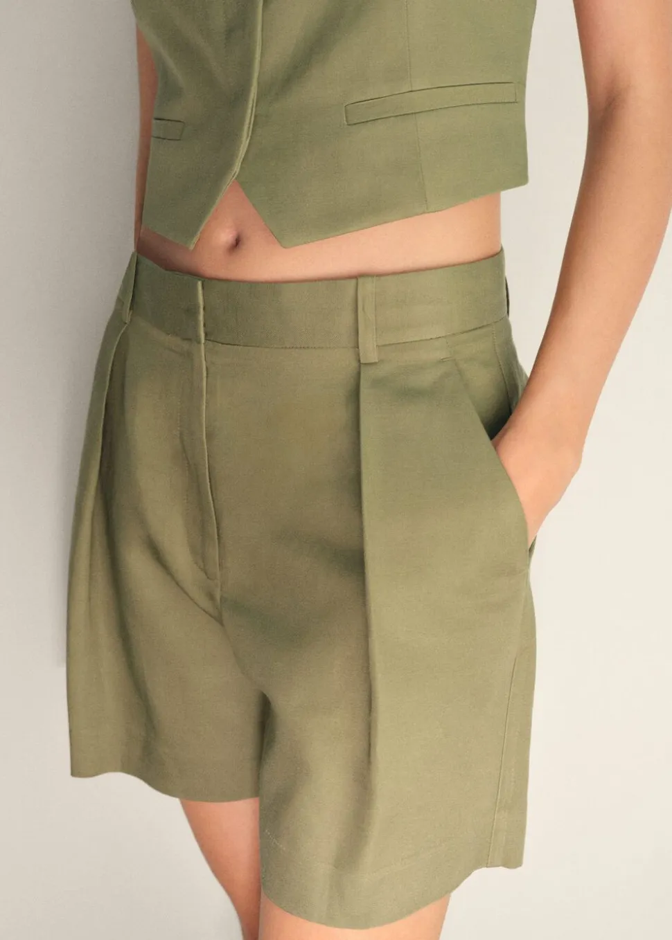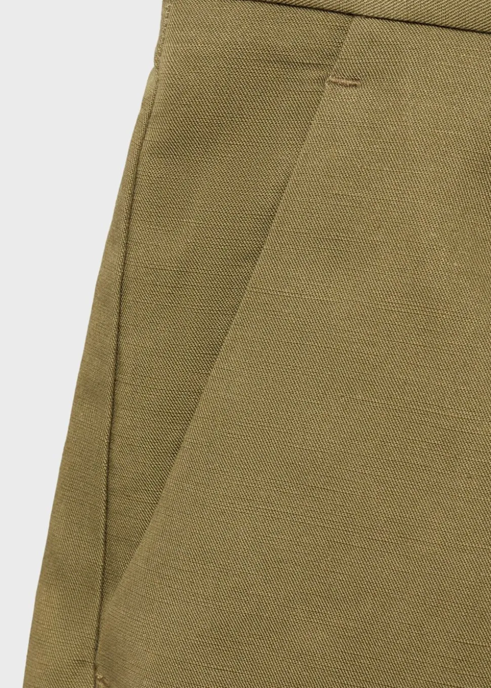 Hørblanding, dragtstil, lige Design, kort Design, høj talje, bæltestropper, to sidelommer, lynlåslukning foran, dobbeltkrog og indvendig knap, totalt look.